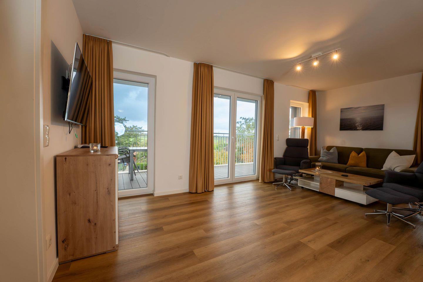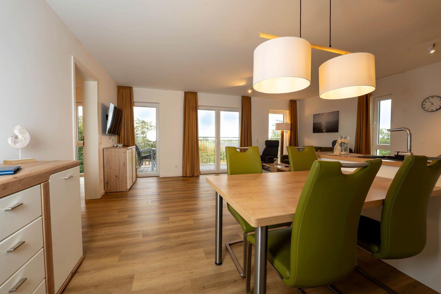 Im großzügigen Wohnbereich mit bequemer Sofaecke könnt Ihr die Seele baumeln lassen. Ob Filmabend, Lesestunde oder geselliges Beisammensein – hier ist der richtige Platz. Der direkte Zugang zum überdachten Balkon eröffnet Euch dabei den schönsten Blick ins Grüne und lässt viel Tageslicht herein.