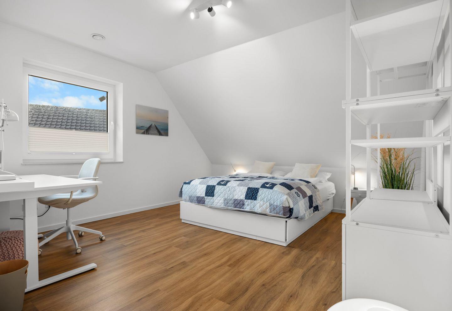 Das Obergeschoss beherbergt zwei Schlafzimmer mit insgesamt vier Schlafmöglichkeiten. Auch hier sorgt der Vinylboden für eine angenehme Atmosphäre. Ein Büro mit Schreibtisch und Monitor bietet Platz zum Arbeiten oder Lesen. Für erholsamen Schlaf sind die Fenster mit Fliegengittern ausgestattet. Die wohnlichen Räume werden durch ein modernes Badezimmer mit bodengleicher Dusche, Kosmetikspiegel, Haartrockner sowie einem zusätzlichen Gäste-WC im Erdgeschoss ergänzt. Ein Verbandskasten steht für Notfälle bereit.