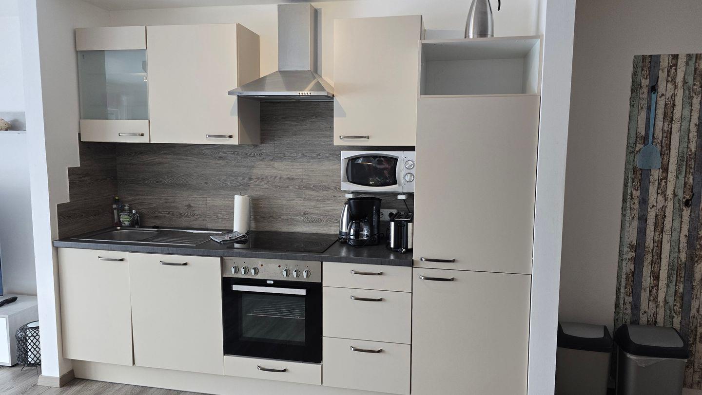 Die voll ausgestattete Küche ist auf Selbstversorger eingerichtet und umfasst einen Ceranherd, Backofen, Kühlschrank mit integriertem Gefrierfach, Mikrowelle, Spülmaschine und eine Vielzahl an Küchenutensilien wie Kaffeemaschine, Toaster, Wasserkocher, Eierkocher, Sandwich-Toaster und Mixer. Ein Essbereich mit passendem Esstisch bietet ausreichend Platz für gemeinsame Mahlzeiten.