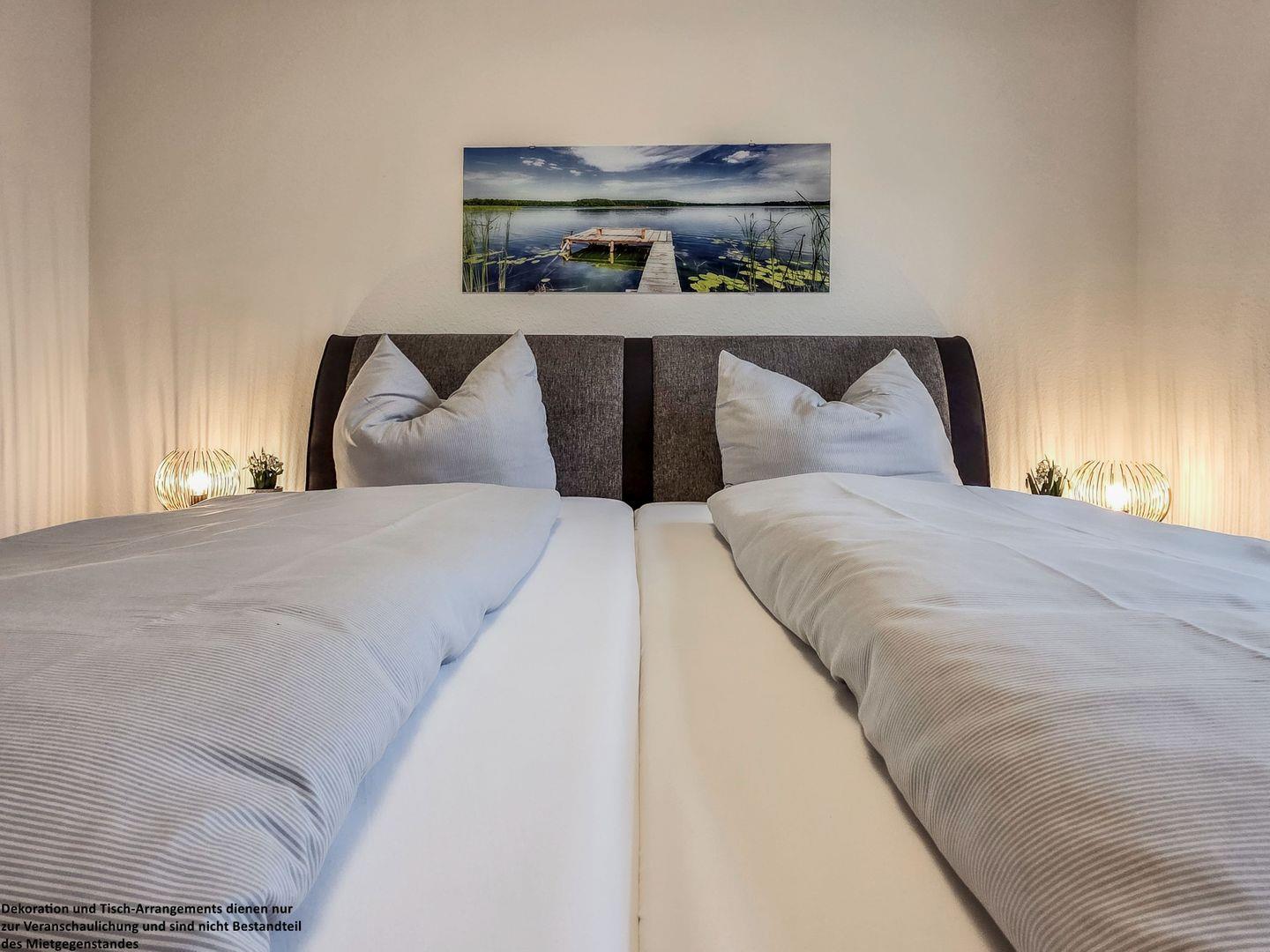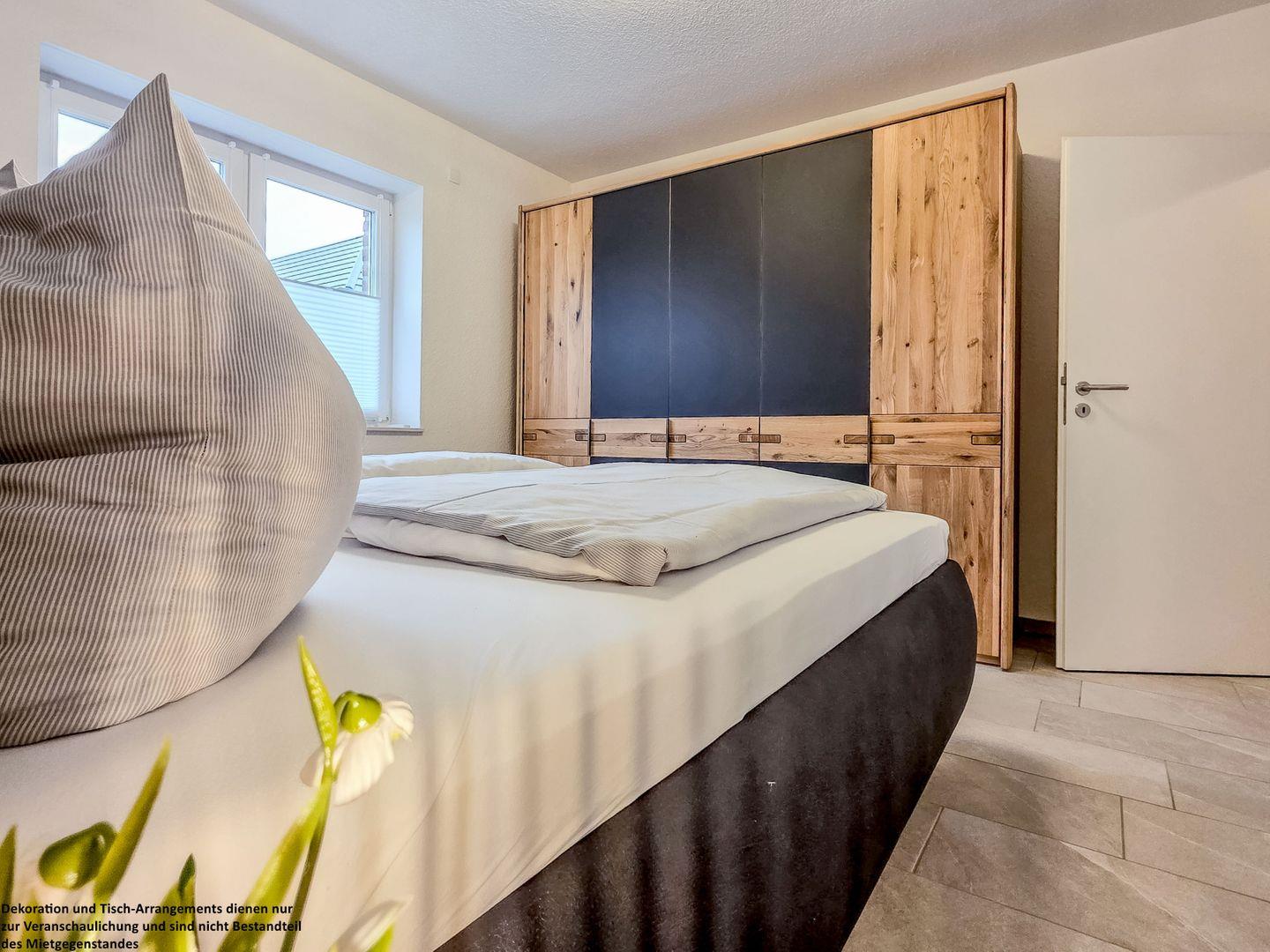 Das Schlafzimmer lädt mit einem hochwertigen, großen Polsterbett zu erholsamen Nächten ein. Der geräumige Kleiderschrank bietet genügend Platz für Ihre Kleidung.