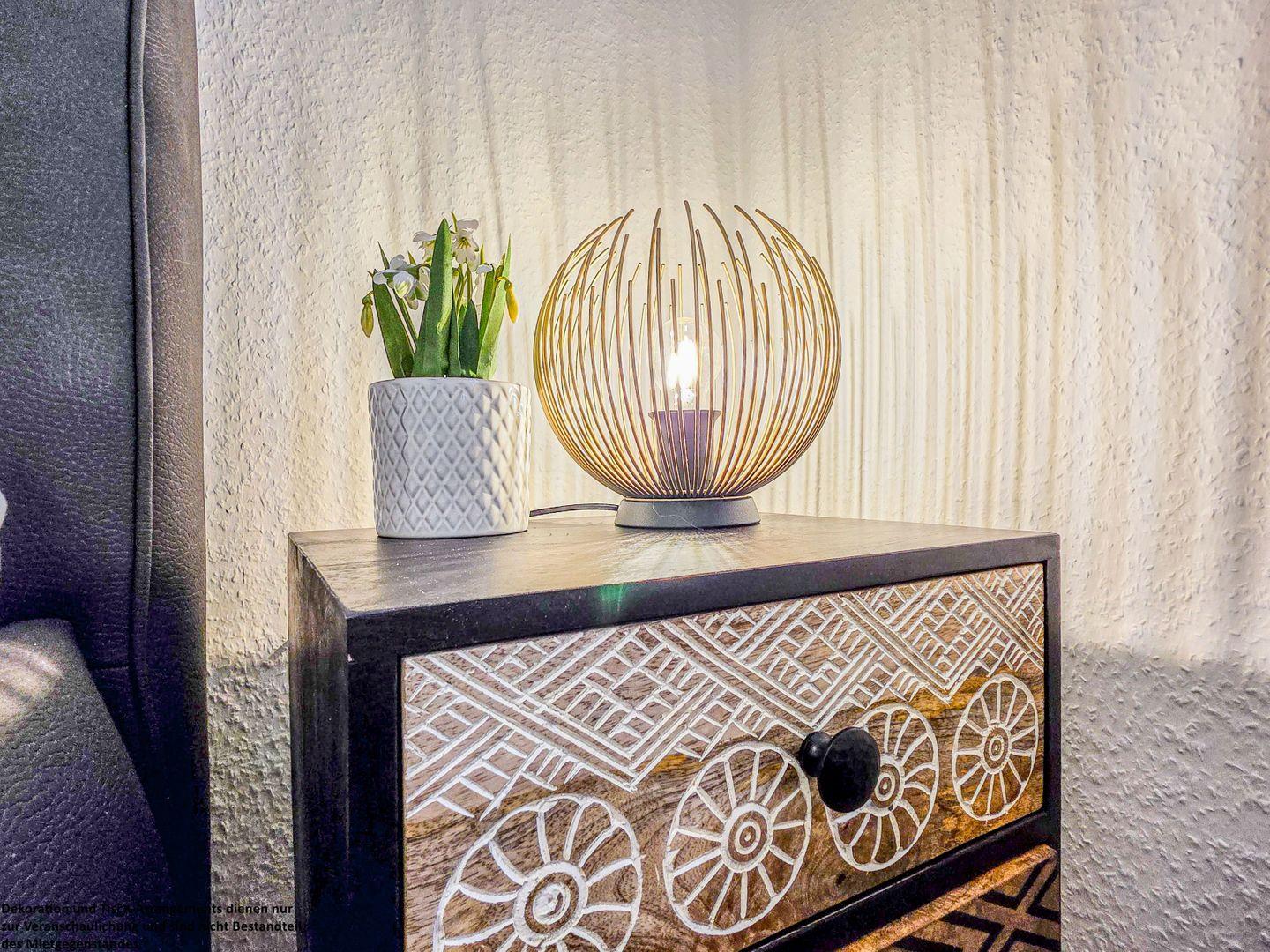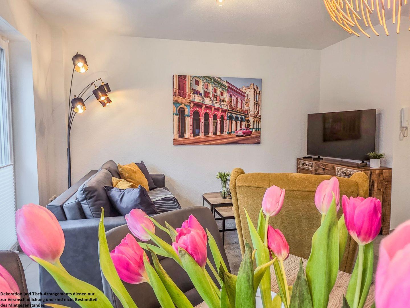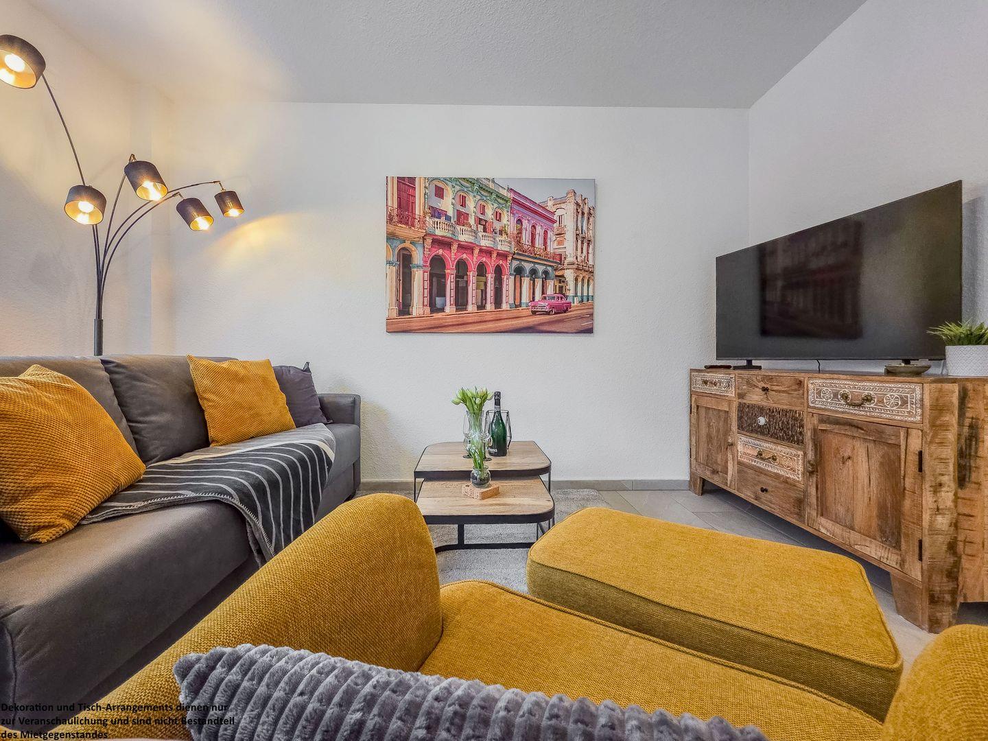 Die bodentiefen Fenster durchfluten die Wohnung mit natürlichem Licht und schaffen eine einladende Atmosphäre. In der gemütlichen Sofaecke oder im komfortablen Ohrensessel lassen sich entspannte Abende vor dem Fernseher genießen. Das Schlafsofa bietet zudem die Möglichkeit, zwei weiteren Personen einen Schlafplatz zu bieten..