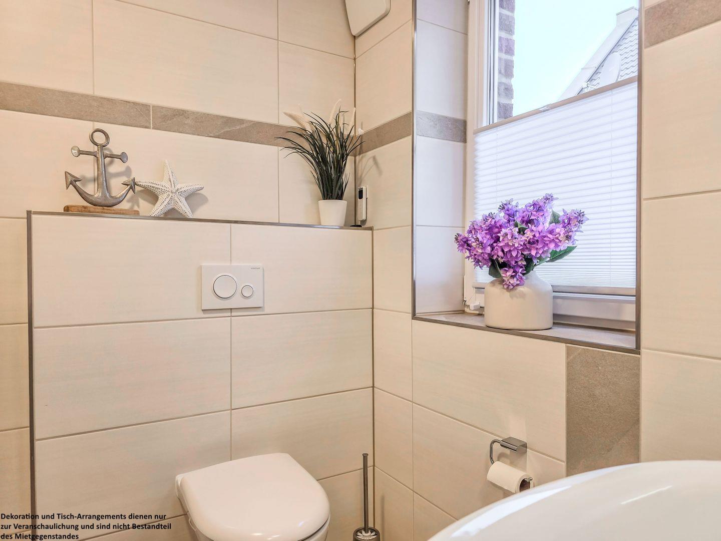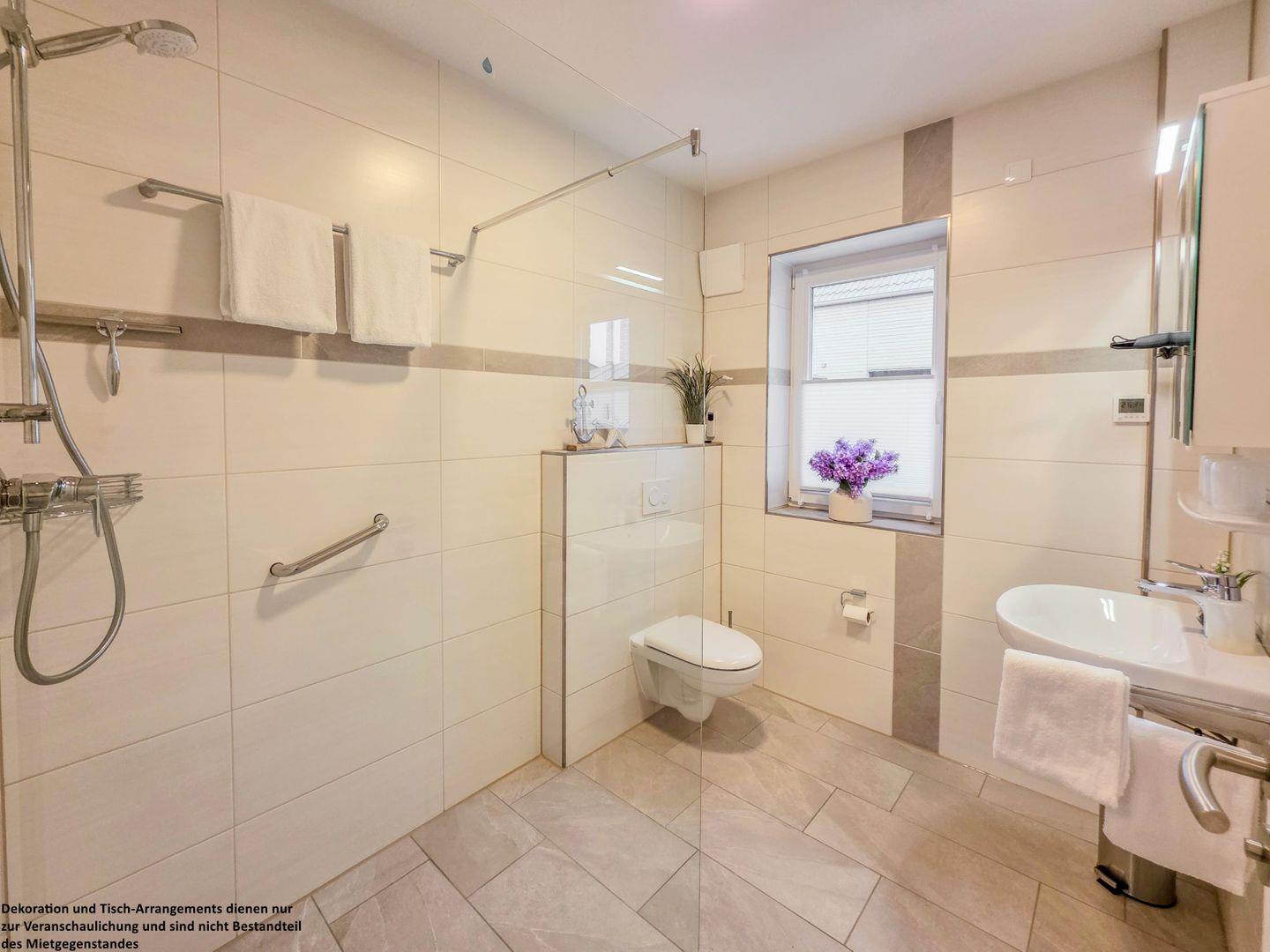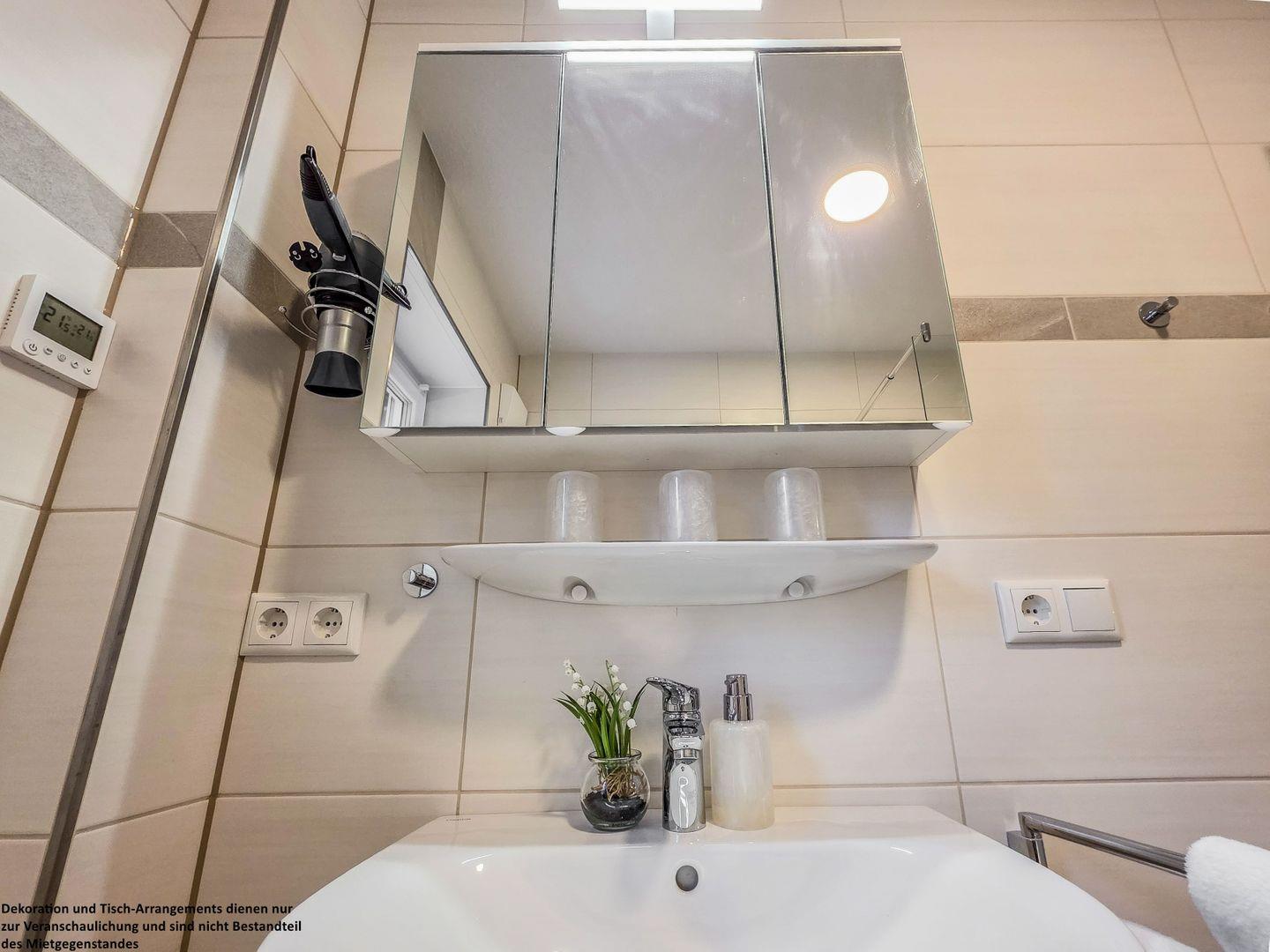 Das hell geflieste Tageslichtbad, abgesetzt mit warmen Erdtönen, verfügt über eine bodengleiche Dusche, einen Spiegelschrank und einen Fön – alles, was Sie für Ihre tägliche Hygiene benötigen.