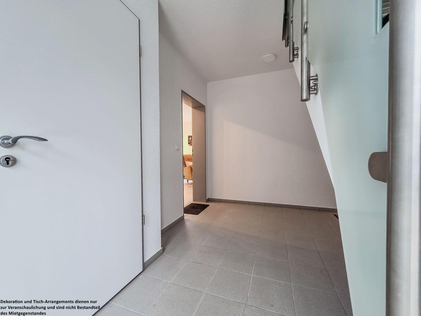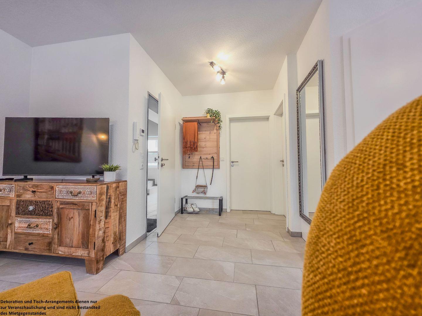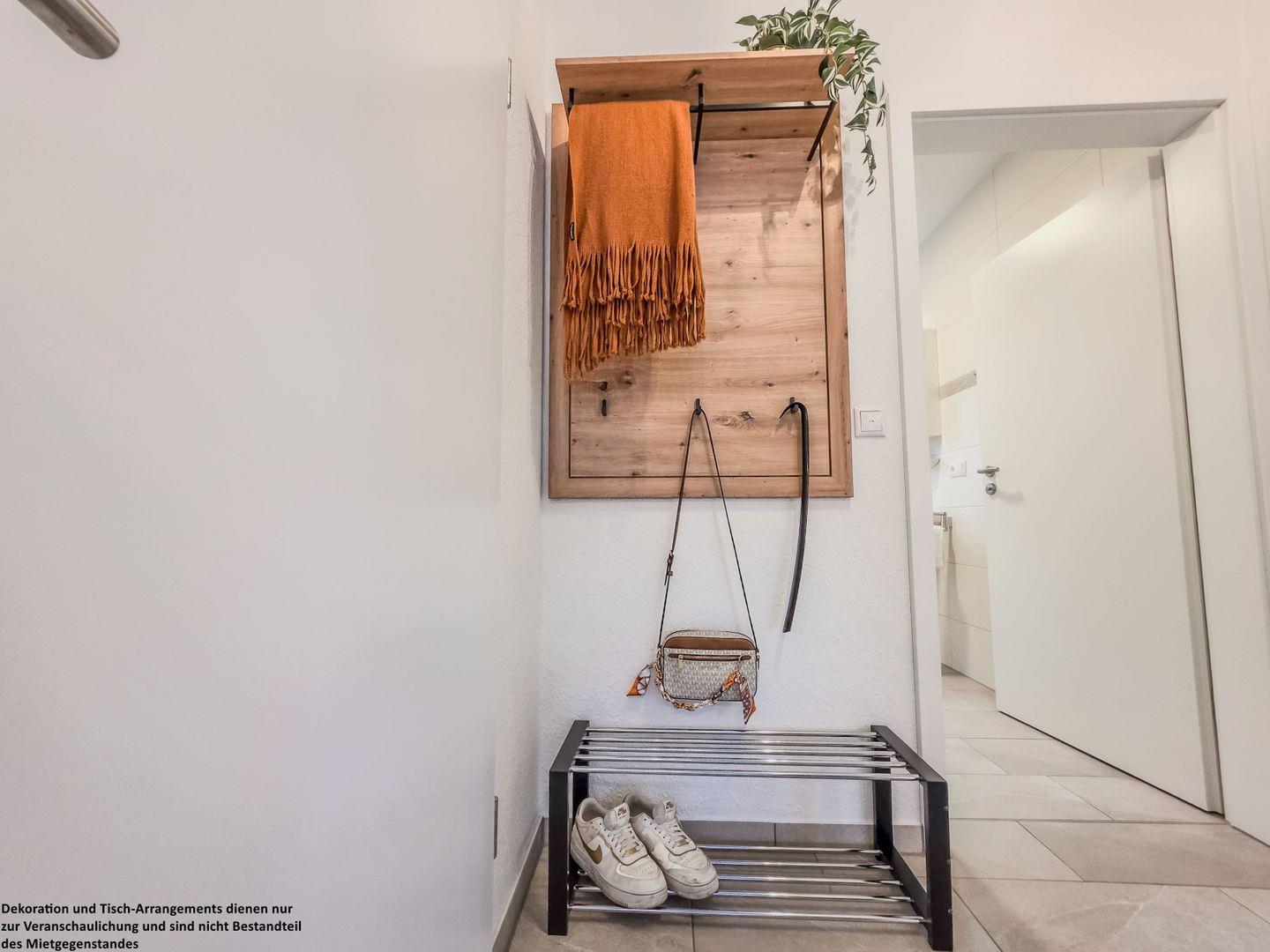 Schon beim Betreten des Flurs werden Sie von der hellen, freundlichen Einrichtung begrüßt. Warme Holzakzente an der Garderobe laden dazu ein, Ihre Jacken stilvoll aufzuhängen, während das praktische Schuhregal für Ordnung sorgt. Der bodenlange Spiegel bietet einen letzten Blick, bevor Sie das Haus verlassen – ein perfekter Start in Ihren Urlaubstag.