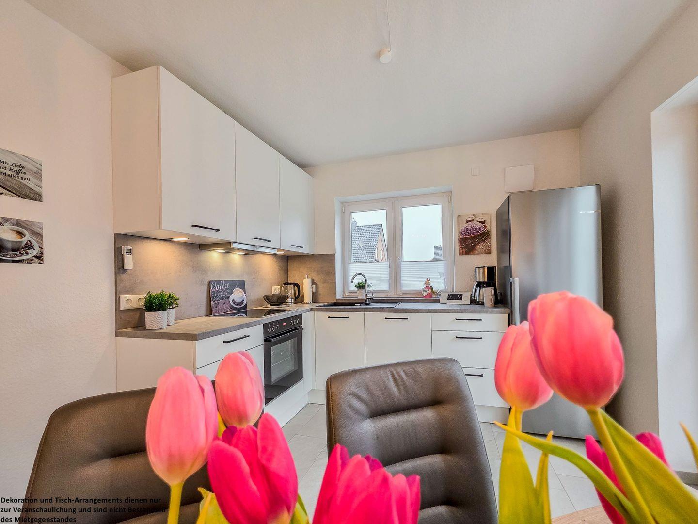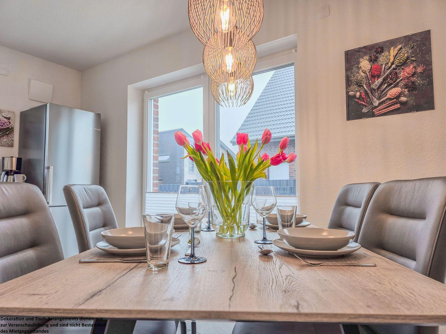 Das angrenzende Esszimmer bietet ausreichend Platz für gemeinsame Mahlzeiten, Spieleabende oder gemütliche Stunden bei einem Glas Wein. Die moderne, offene Küche ist mit allem ausgestattet, was Sie für eine Selbstversorgung benötigen – von der Spülmaschine über den Gefrierschrank bis zu allen nötigen Küchenutensilien.