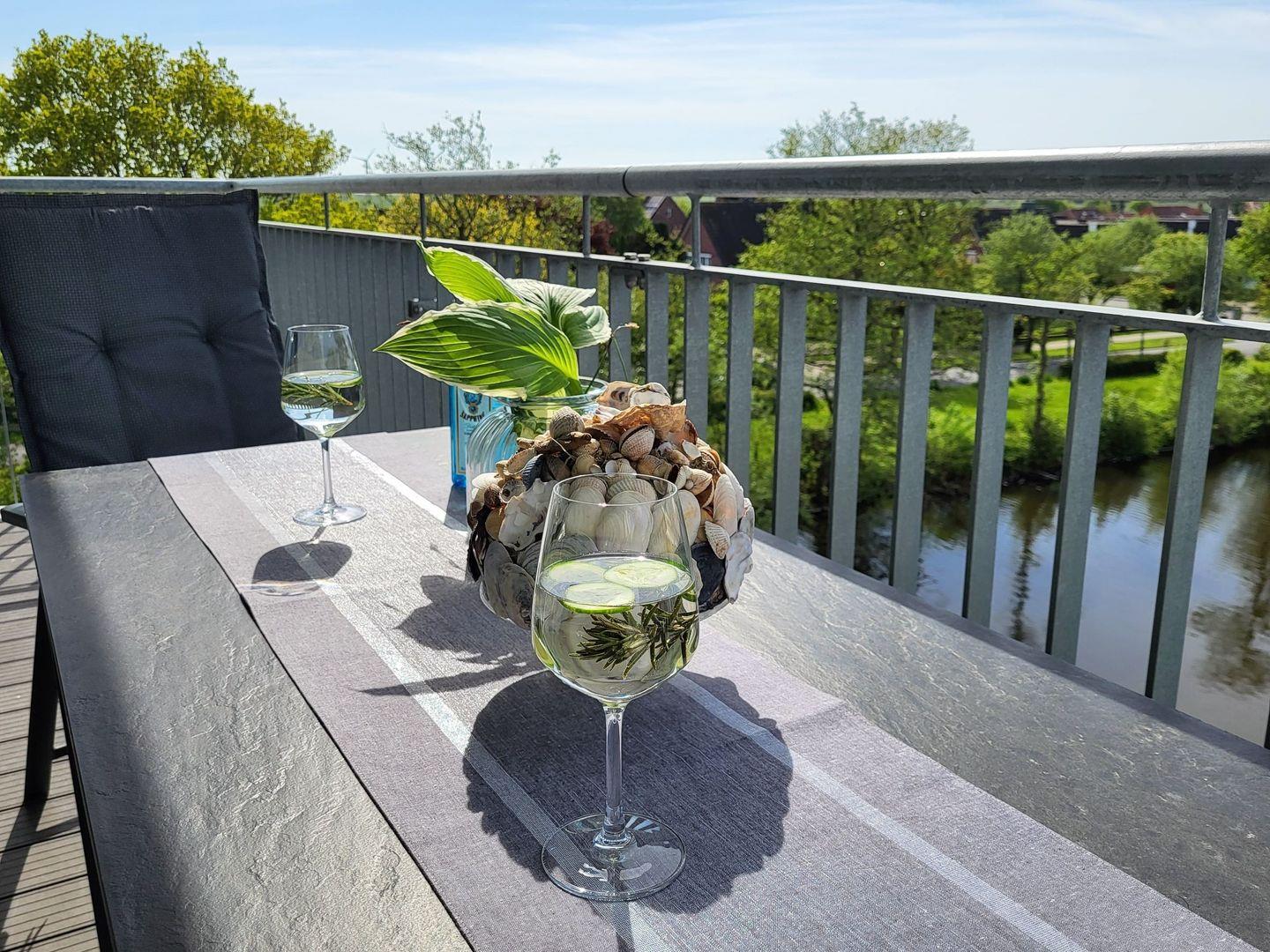 Eine großzügiger, möblierter und überdachter Balkon lädt zum Verweilen ein.