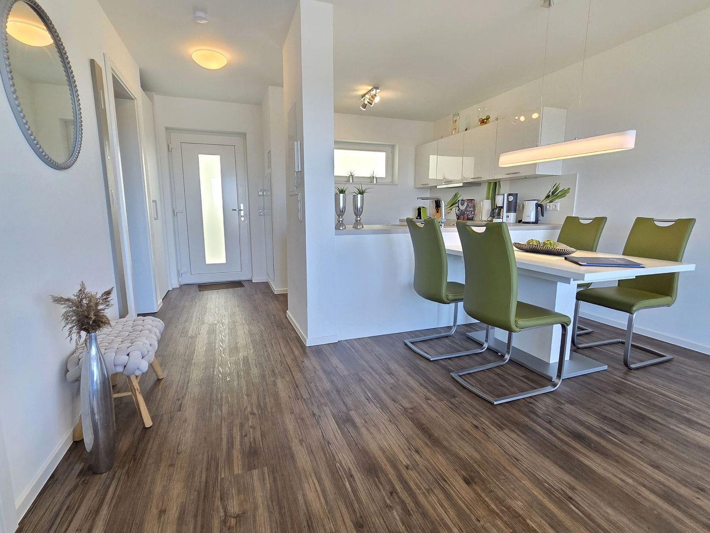 Der Küchenbereich ist modern offen zum Wohn-Essbereich gehalten und mit einer hochwertigen Einbauküche ausgestattet.