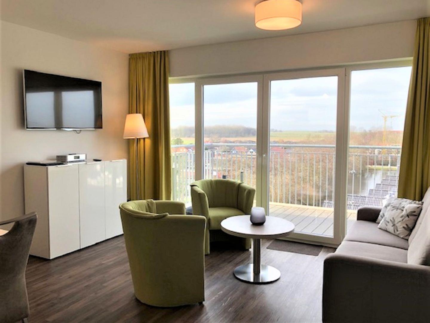 Der helle Wohnbereich verfügt über ein Sofa, ein Couchtisch und zwei Sessel sowie ein Fernsehgerät. Der nach westen ausgerichtete, großzügige Balkon schließt sich an.