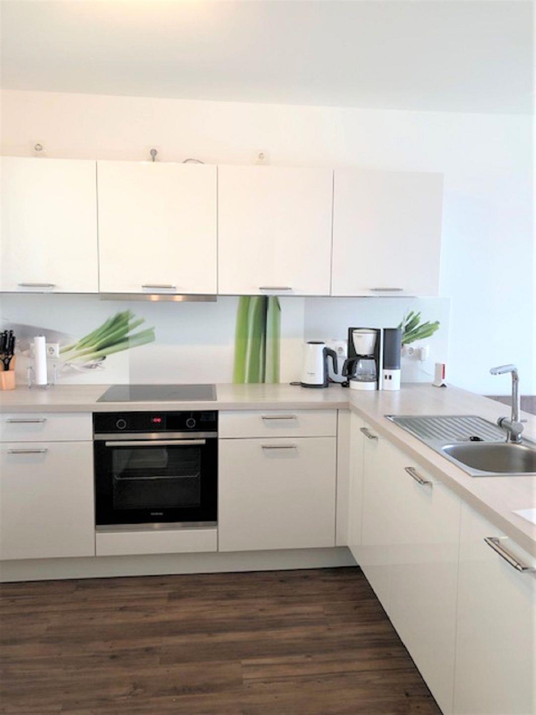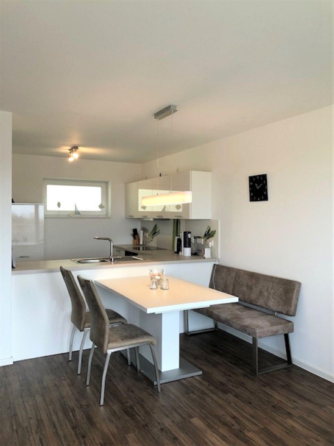 Der Küchenbereich ist modern offen zum Wohn-Essbereich gehalten und mit einer hochwertigen Einbauküche ausgestattet.