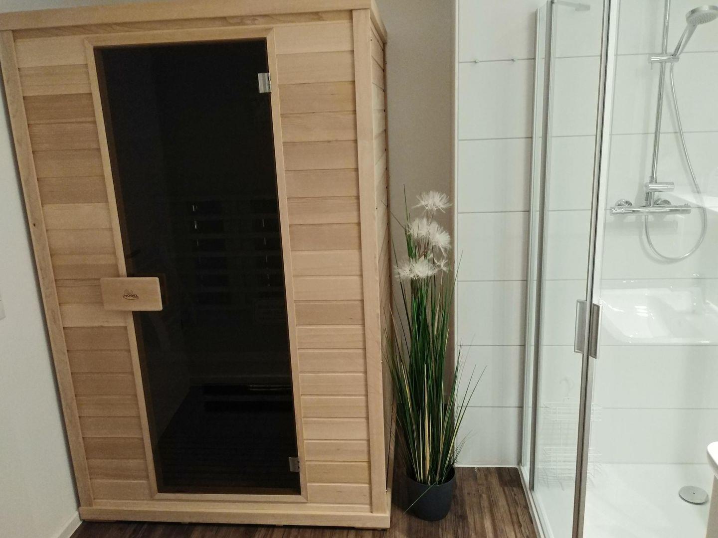 Das Badezimmer ist sehr großzügig geschnitten und mit einer Regendusche und einer Infrarotkabine ausgestattet.