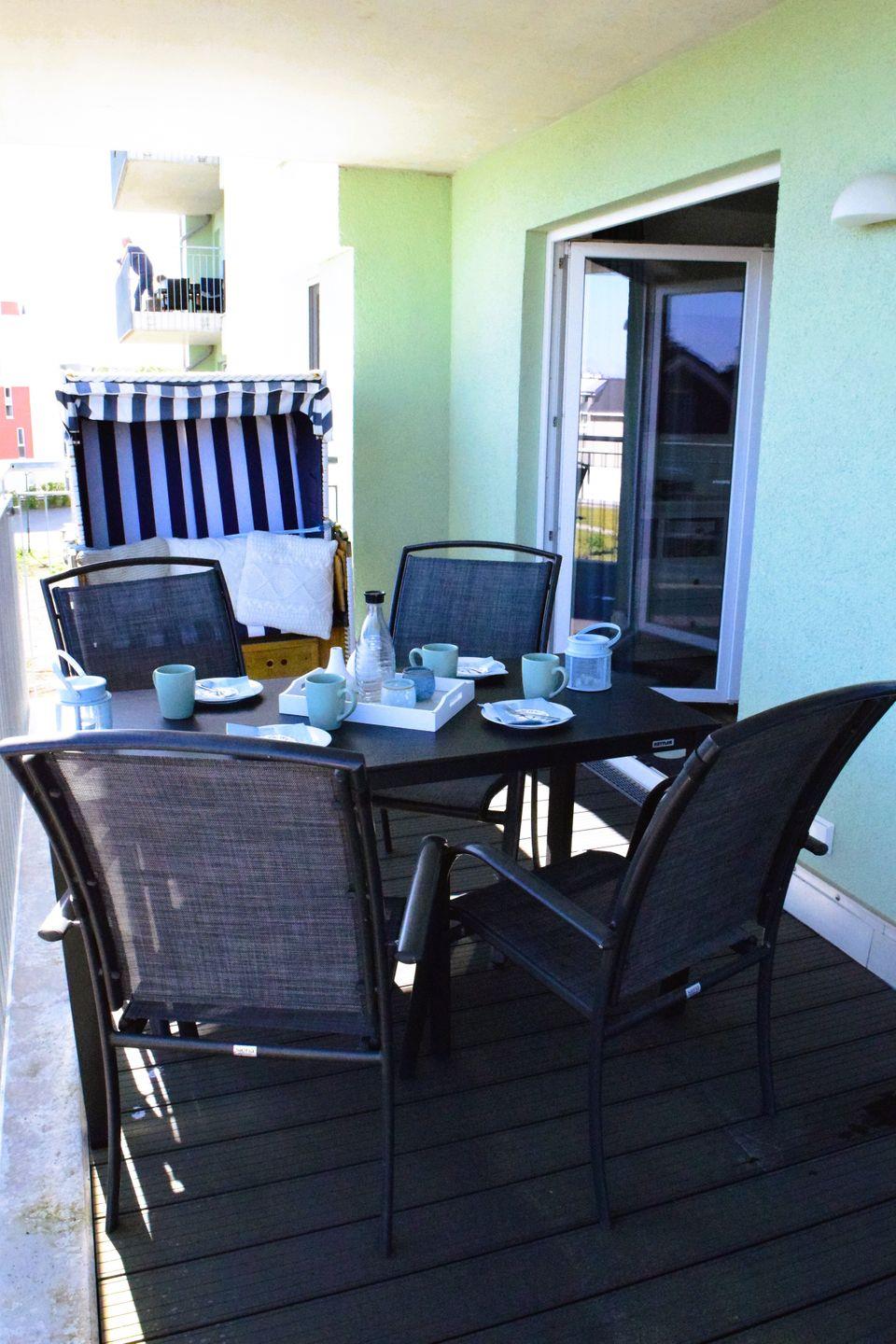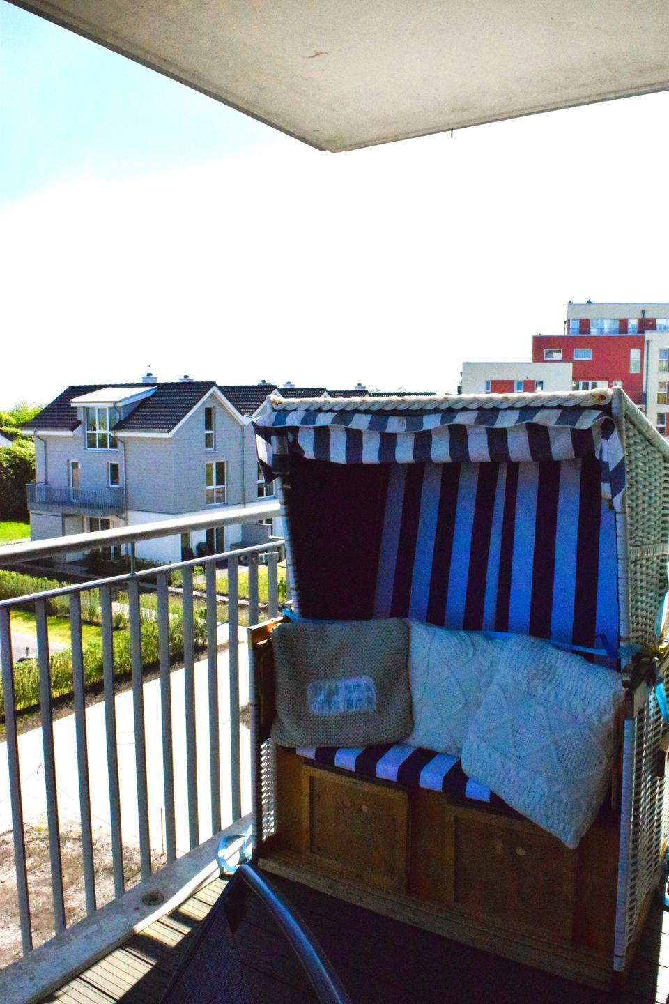 Ein großzügiger, möblierter und überdachter Balkon lädt zum Verweilen ein. Neben der Außenbestuhlung steht Ihnen hier ein Strandkorb zur Verfügung.
