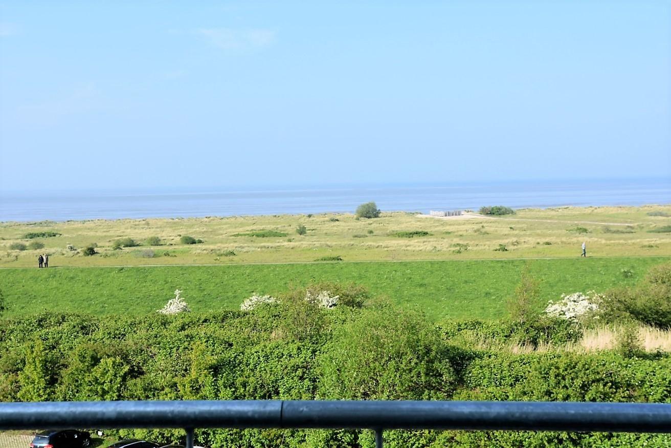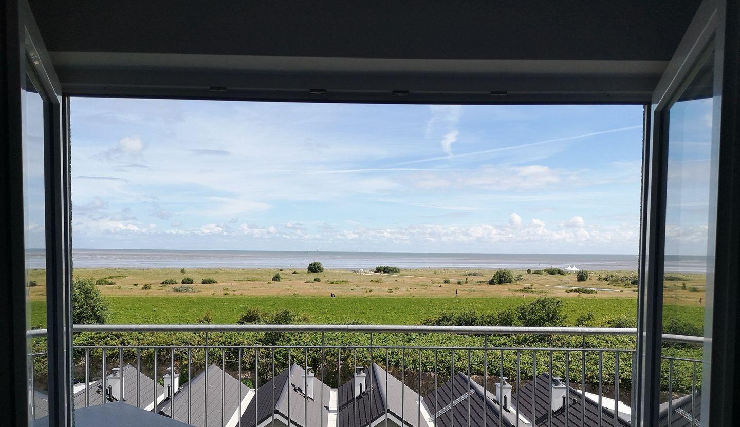 Der großzügige, möblierte Balkon ist nach Norden ausgerichtet und bietet einen herrlichen Blick auf das Wattenmeer.