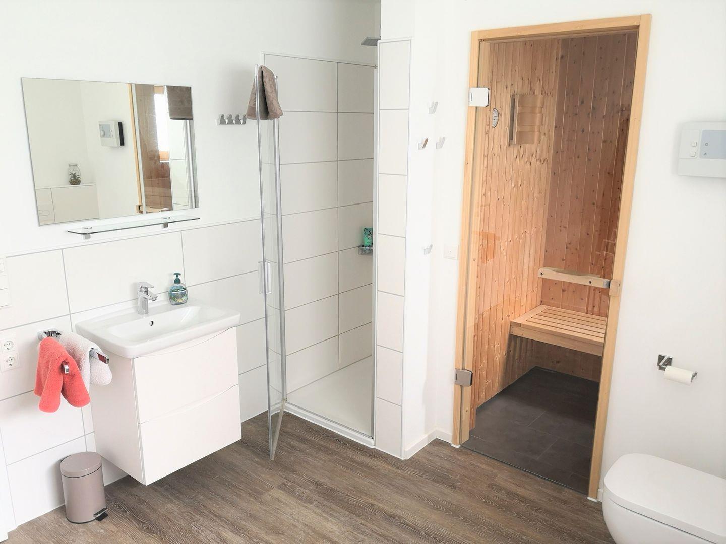 Eine Sauna, eine ebenerdige Dusche und eine Badewanne bieten den nötigen Komfort zur Erholung.
