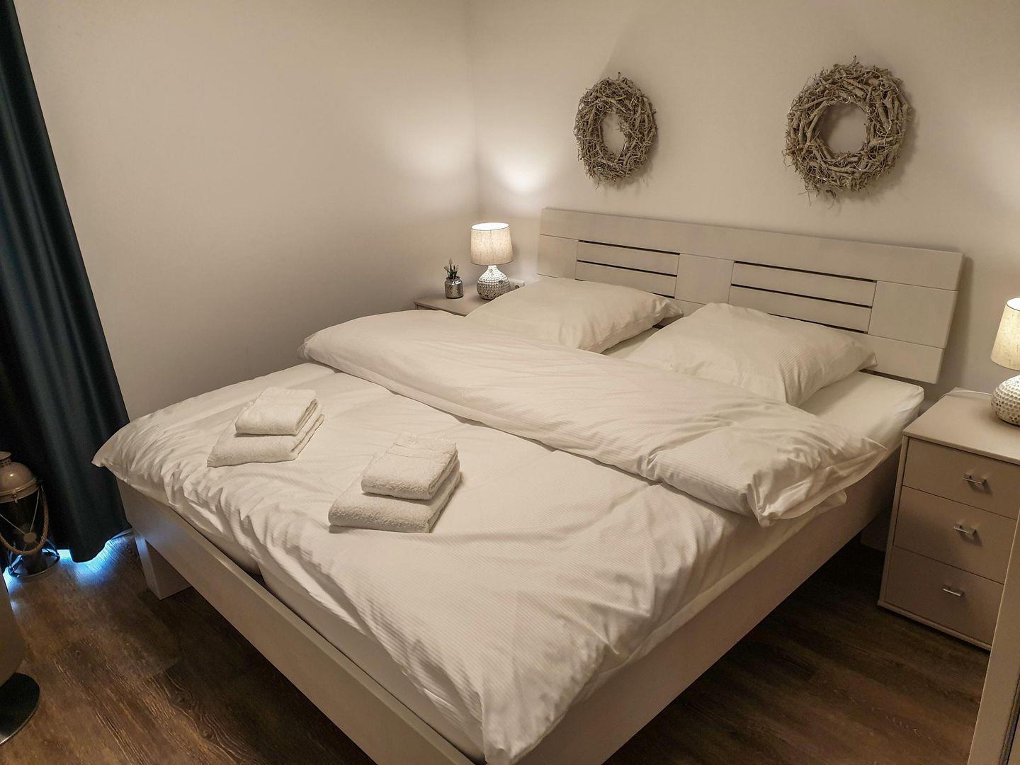In jedem Schlafzimmer steht Ihnen ein Doppelbett mit Nachtkonsolen, ein Kleiderschrank sowie ein weiterer Fernseher zur Verfügung.