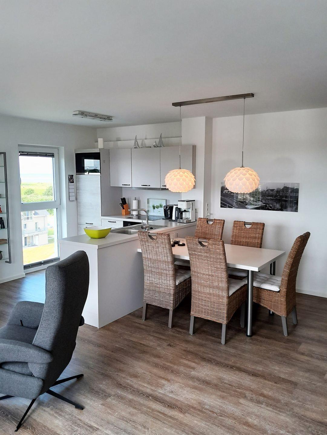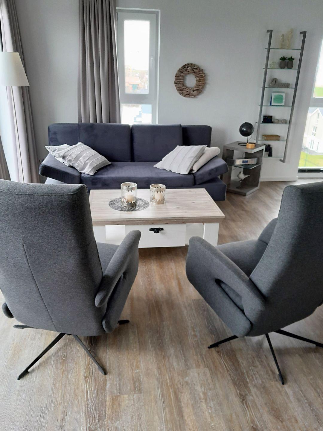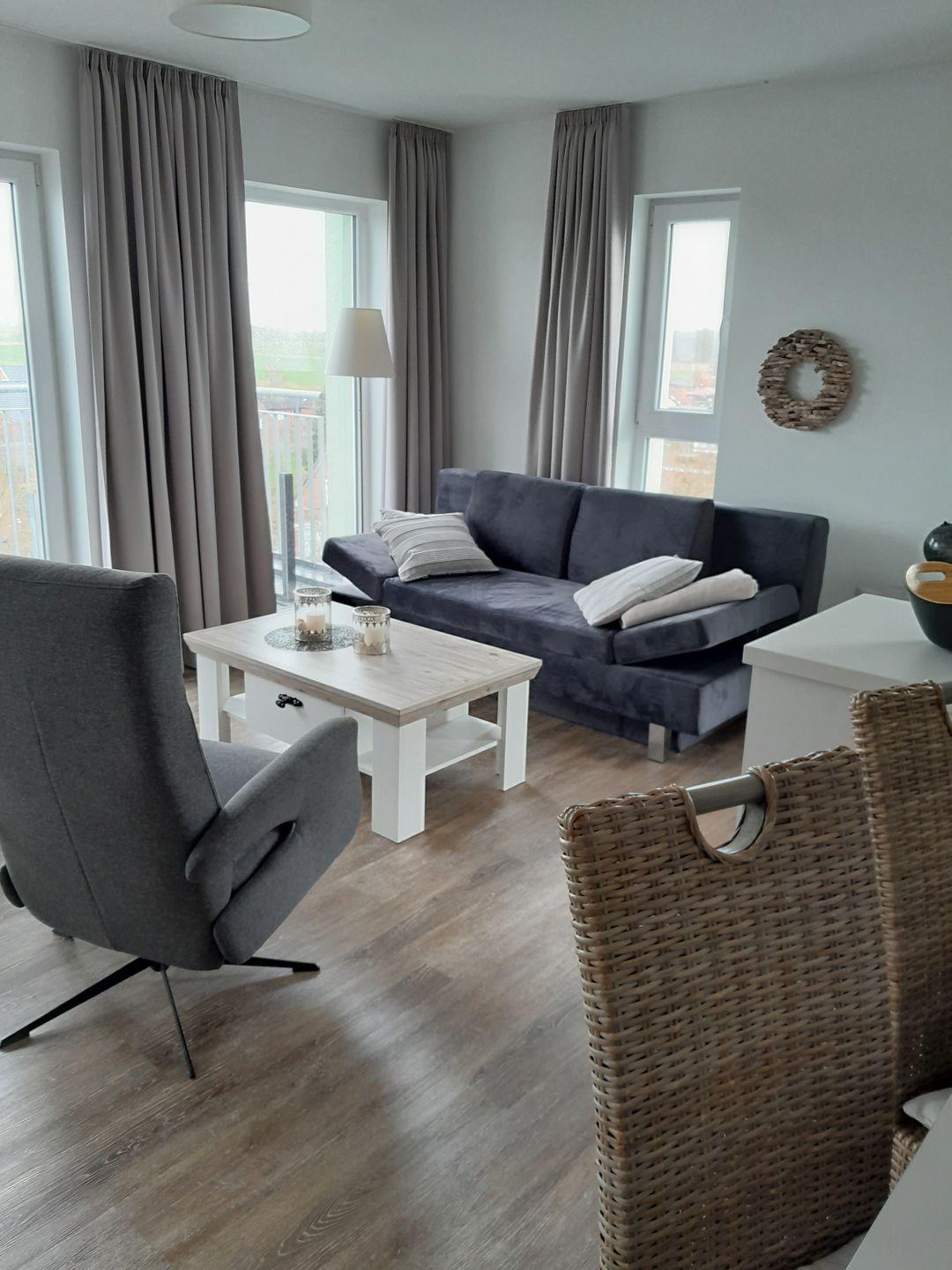 Ausgestattet mit einem Sofa, Couchtisch und zwei Sessel, besticht der Wohnbereich durch seine integrierte Küchenzeile und seinem großzügigen Esstisch mit vier Stühlen.
