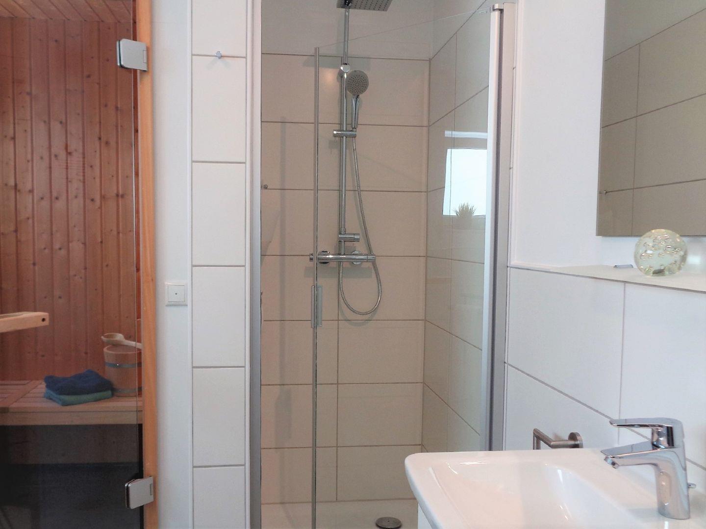 Eine Sauna, eine ebenerdige Dusche und eine Badewanne bieten den nötigen Komfort zur Erholung.
