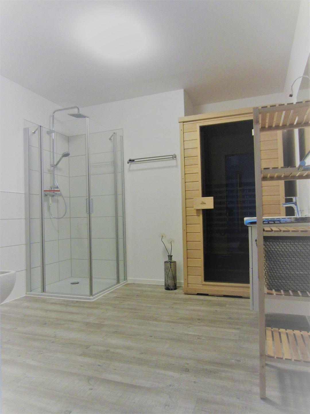 Das großzügige Duschbad verfügt zusätzlich über eine Infrarotkabine.