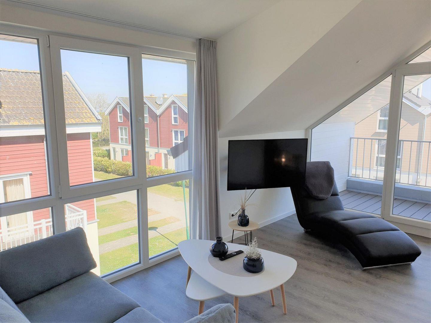 Auch hier bietet eine gemütliche Sofaecke mit Fernseher und eine Relax Liege die Möglichkeit zum Entspannen.