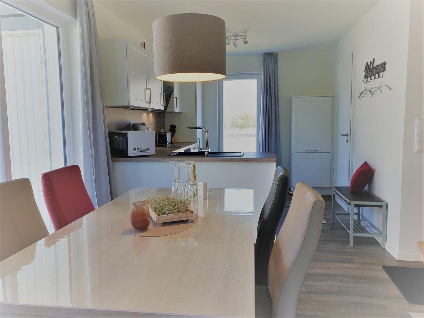 Die Küche ist offengehalten und mit einer hochwertigen Einbauküche inklusive Mikrowelle ausgestattet.
