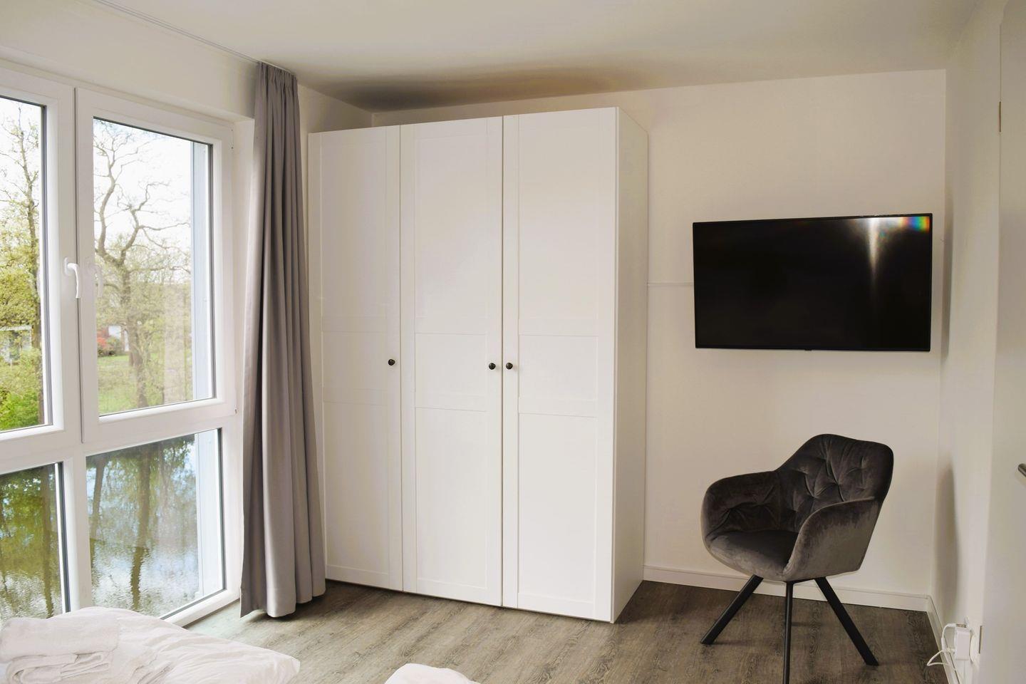 Das Elternschlafzimmer ist mit einem Fernseher ausgestattet .