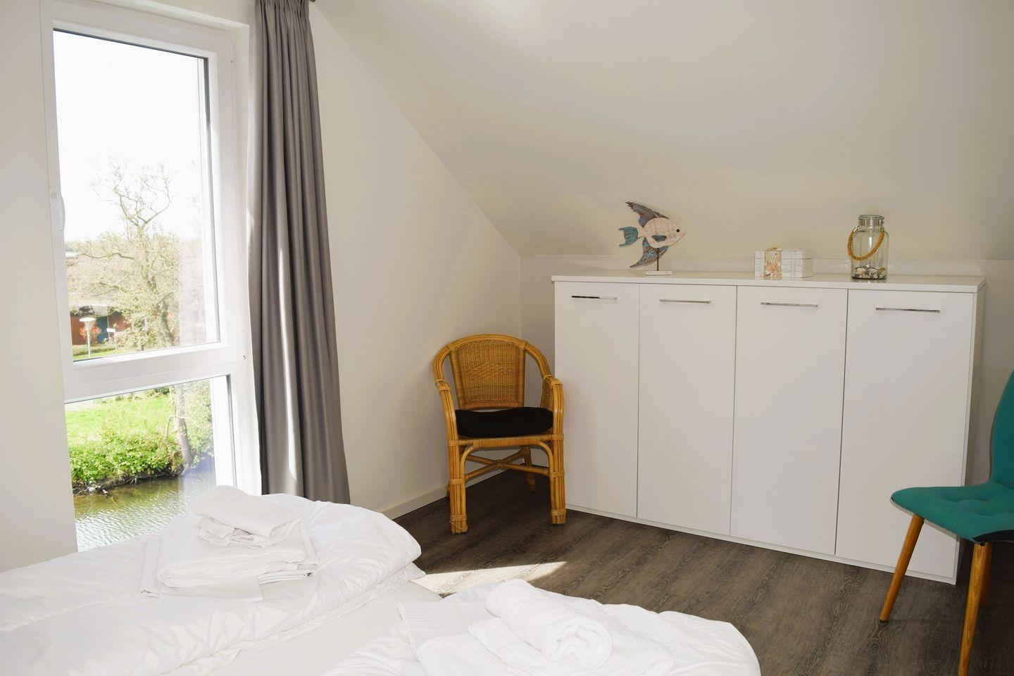 Die erste Etage bietet Ihnen neben zwei Schlafräumen, das große Bad mit ebenerdiger Dusche, Badewanne und Sauna.