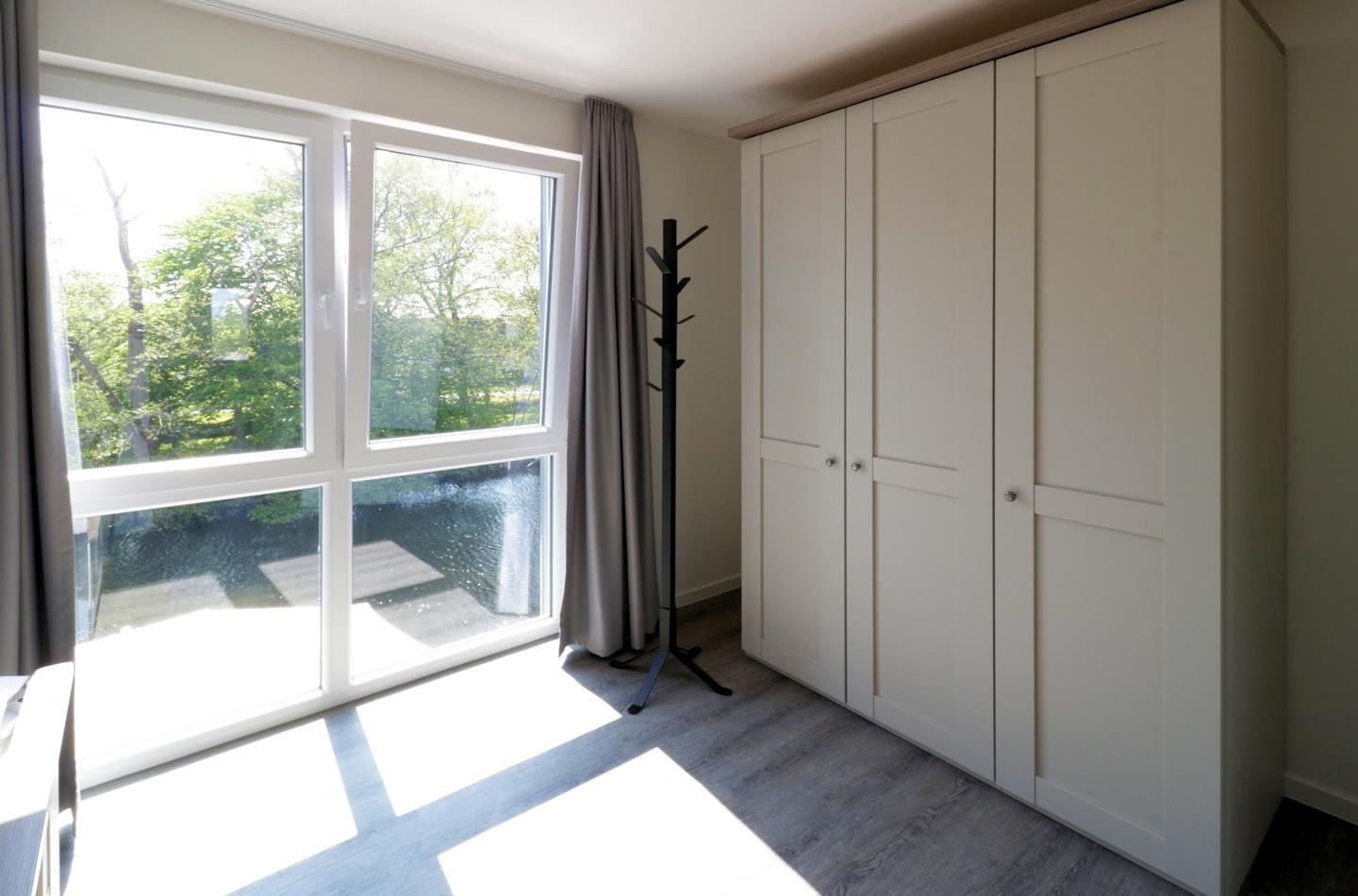 Die über der Graft schwebende Süd-Terrasse ist mit einem Tisch und sechs Sitzgelegenheiten sowie einem Sonnenschirm möbliert.