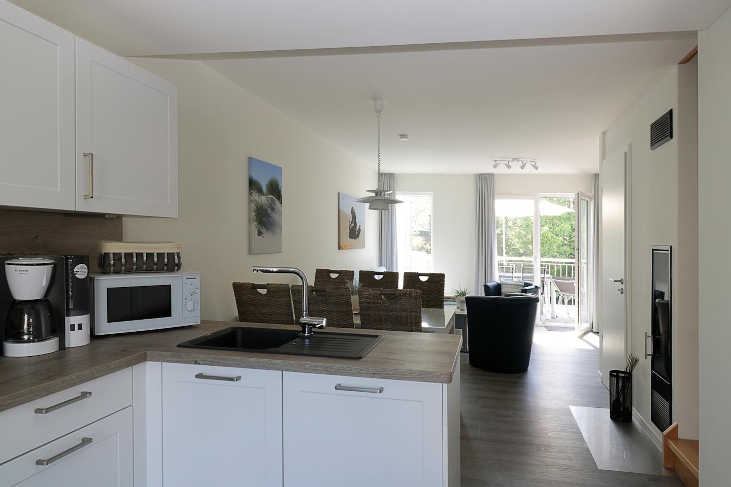 die Küche ist offengehalten und mit einer hochwertigen Einbauküche inklusive Mikrowelle ausgestattet.