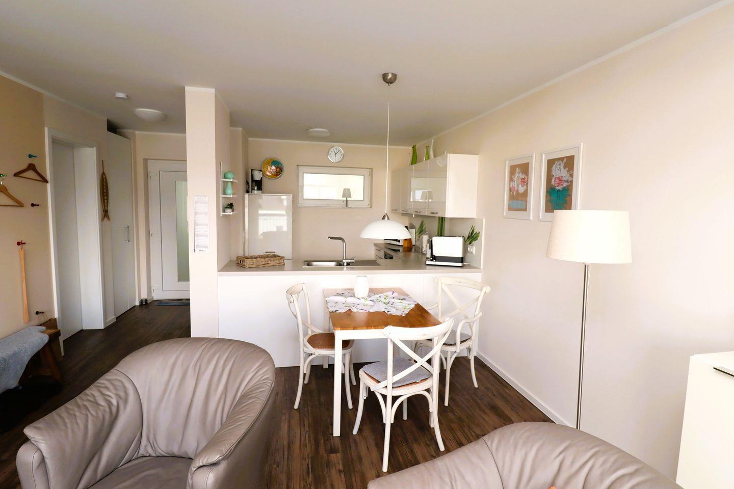 Der Küchenbereich ist modern offen zum Wohn-Essbereich gehalten und mit einer hochwertigen Einbauküche ausgestattet. Hierzu gehören Geschirr, Besteck, Gläser, Töpfe, Pfannen, Auflaufform, Stabmixer und ein Kaffeevollautomat (ganze Bohnen).