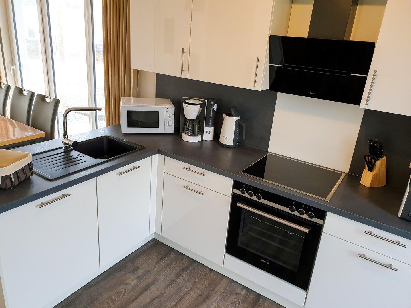 die Küche ist offengehalten und mit einer hochwertigen Einbauküche inklusive Mikrowelle ausgestattet.