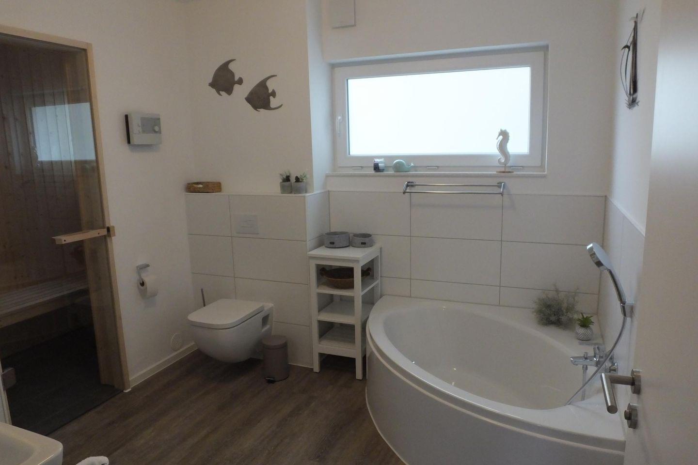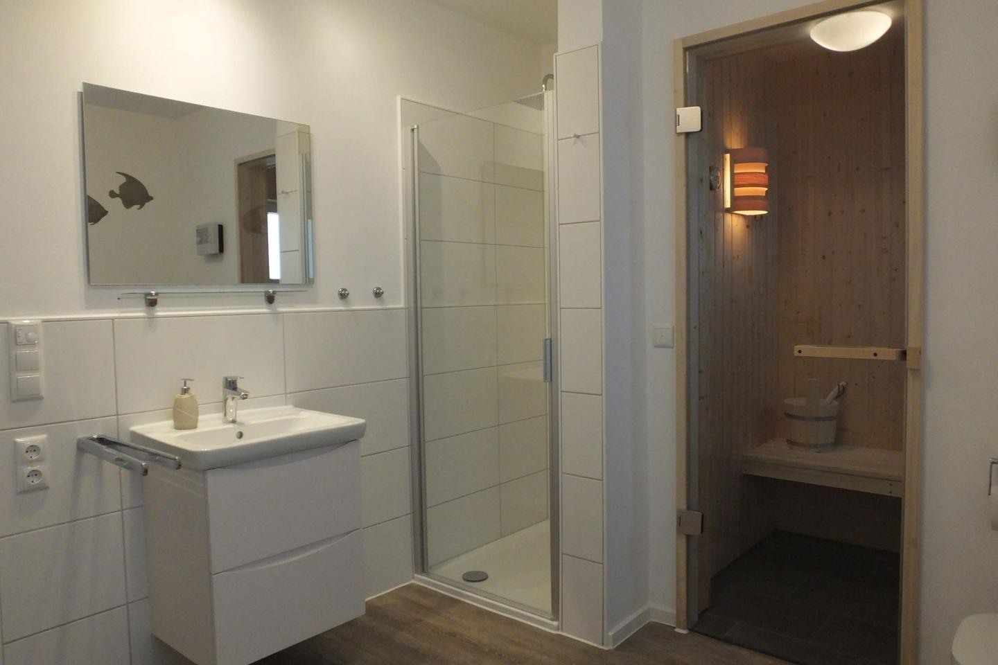 Eine Sauna, eine ebenerdige Dusche und eine Badewanne bieten den nötigen Komfort zur Erholung.