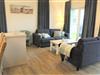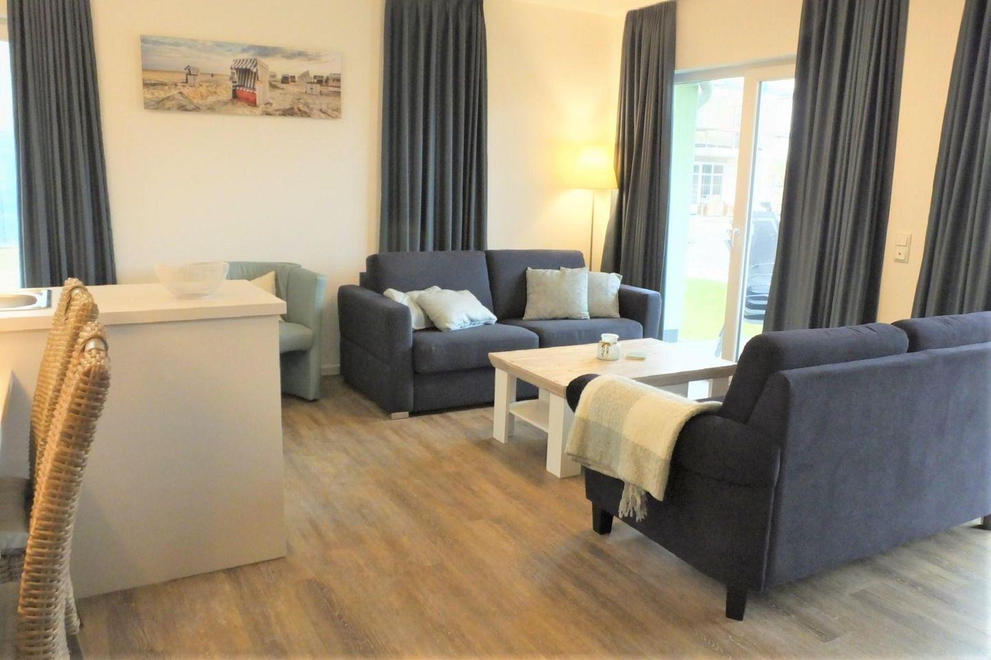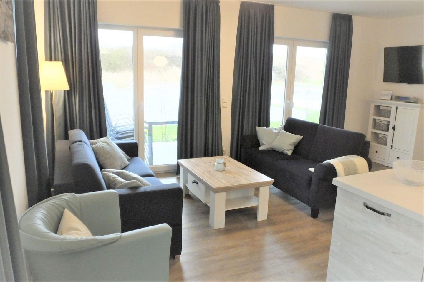 Ausgestattet mit zwei Sofas einem Couchtisch und zwei Sesseln, besticht der Wohnbereich durch seine integrierte Küchenzeile und seinem großzügigen Esstisch mit vier Stühlen.