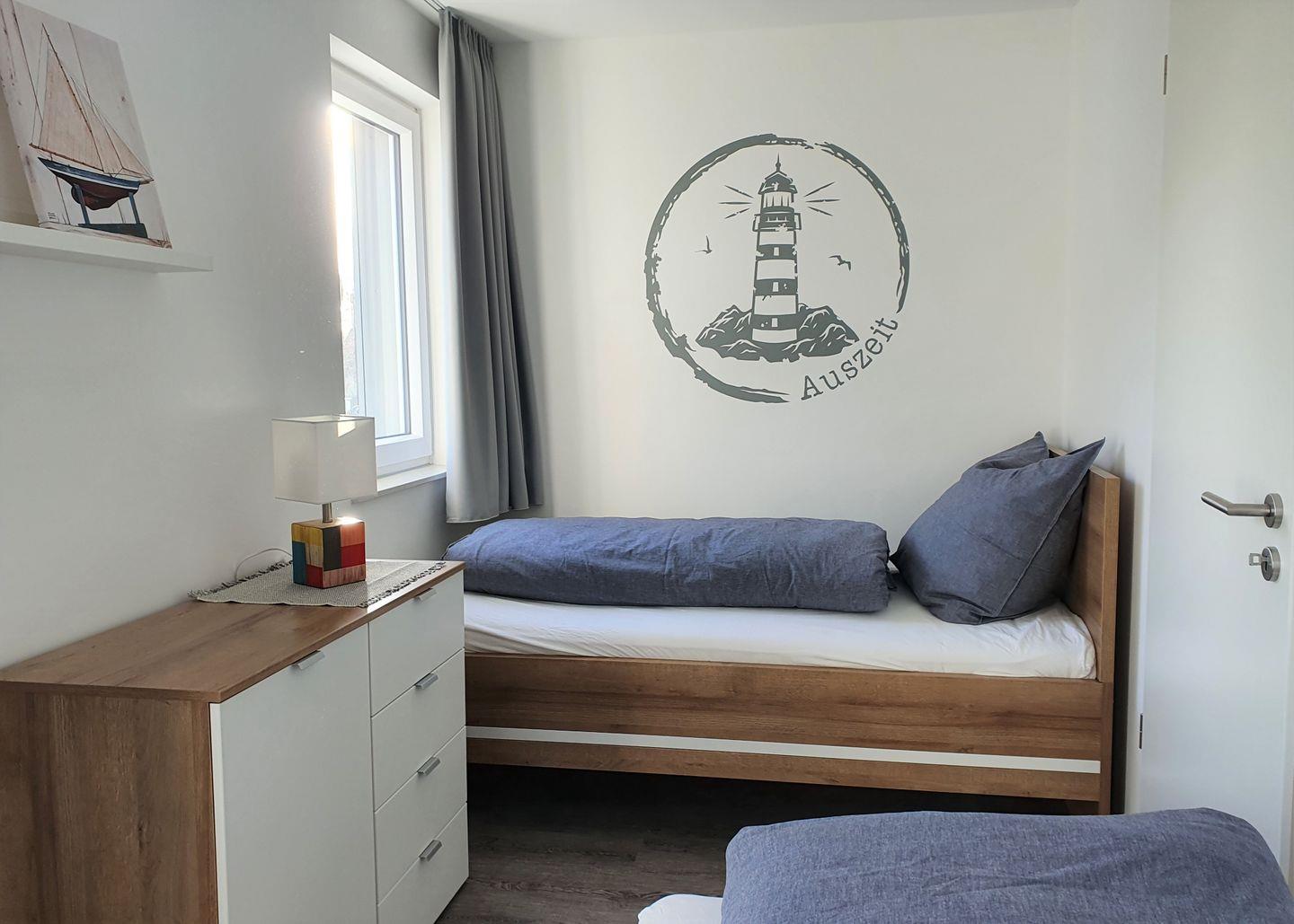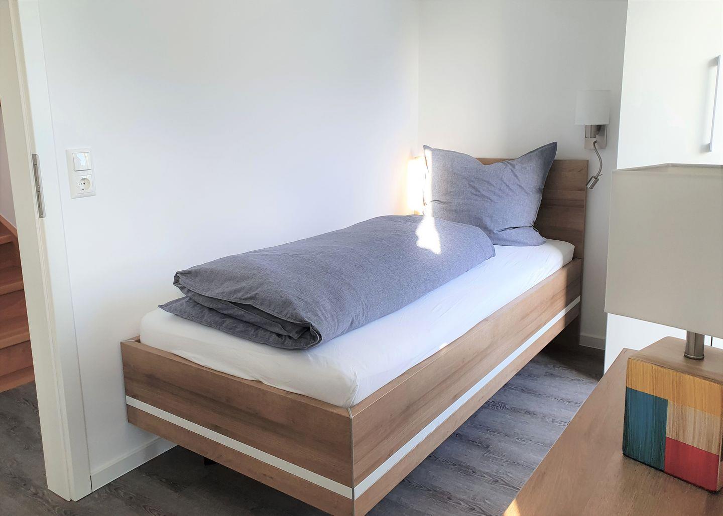 Die erste Etage bietet Ihnen neben zwei Schlafräumen, das große Bad mit ebenerdiger Dusche, Badewanne und Sauna.