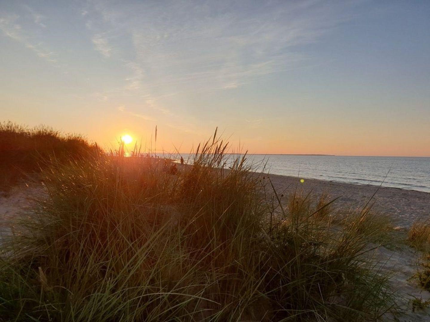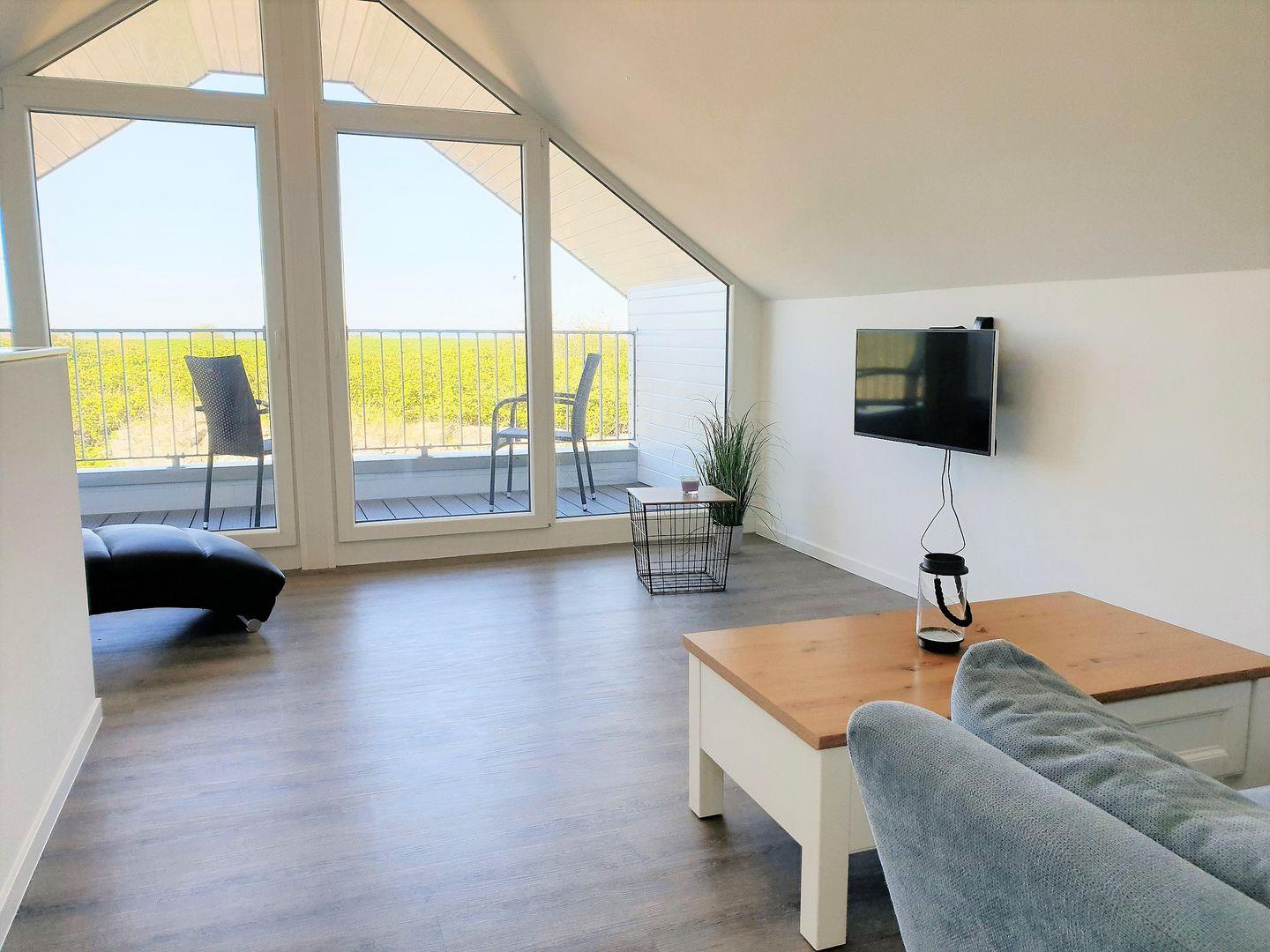 Die Süd-Terrasse ist mit einem Tisch und sechs Sitzgelegenheiten sowie einem Sonnenschirm möbliert. Ein Strandkorb steht Ihnen am Badestrand (nicht Hundestrand) kostenlos zur Verfügung.