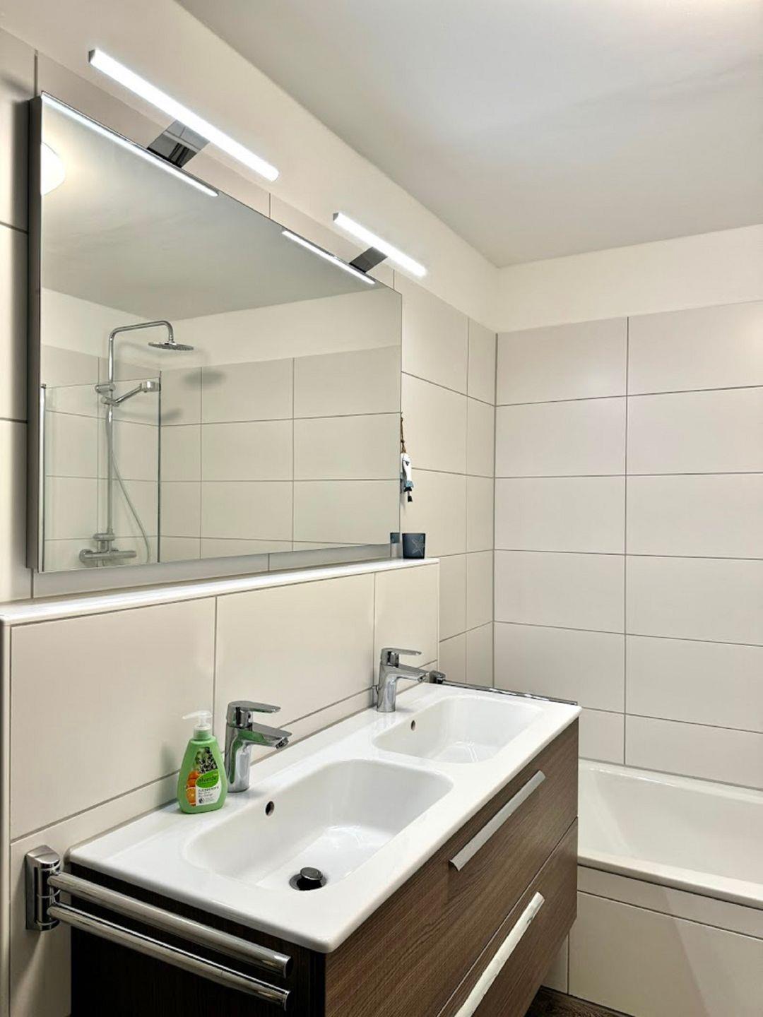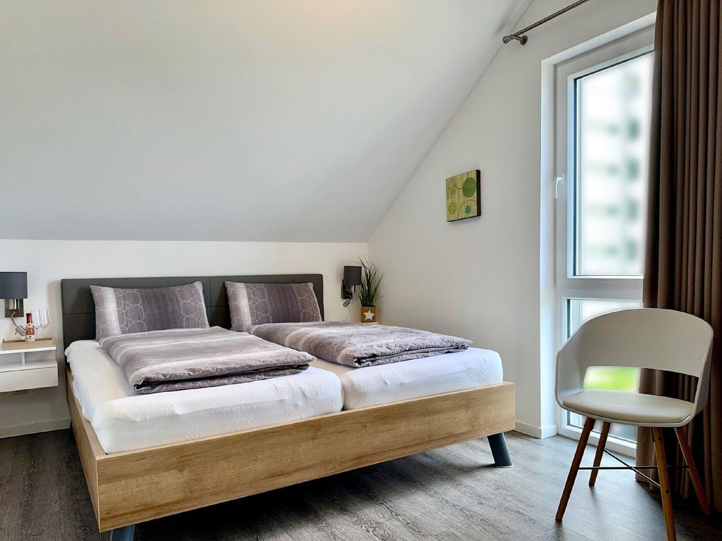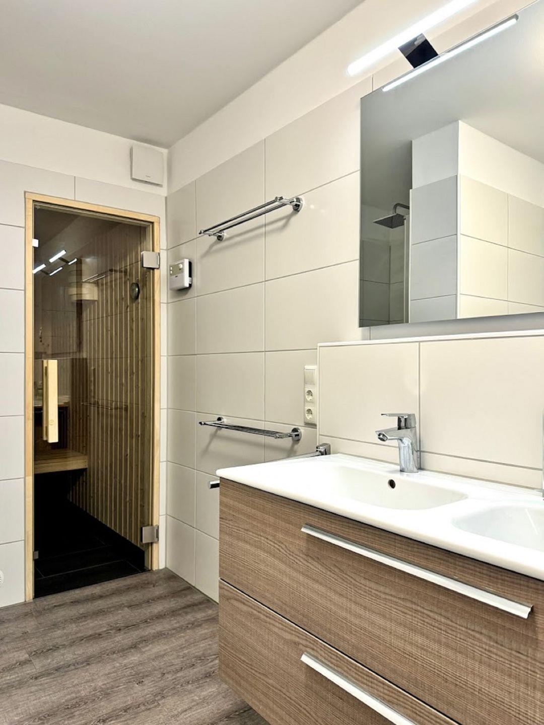 Die erste Etage bietet Ihnen neben zwei Schlafräumen, auch das große Bad mit moderner Regendusche, Badewanne mit Regendusche und hauseigener Sauna.