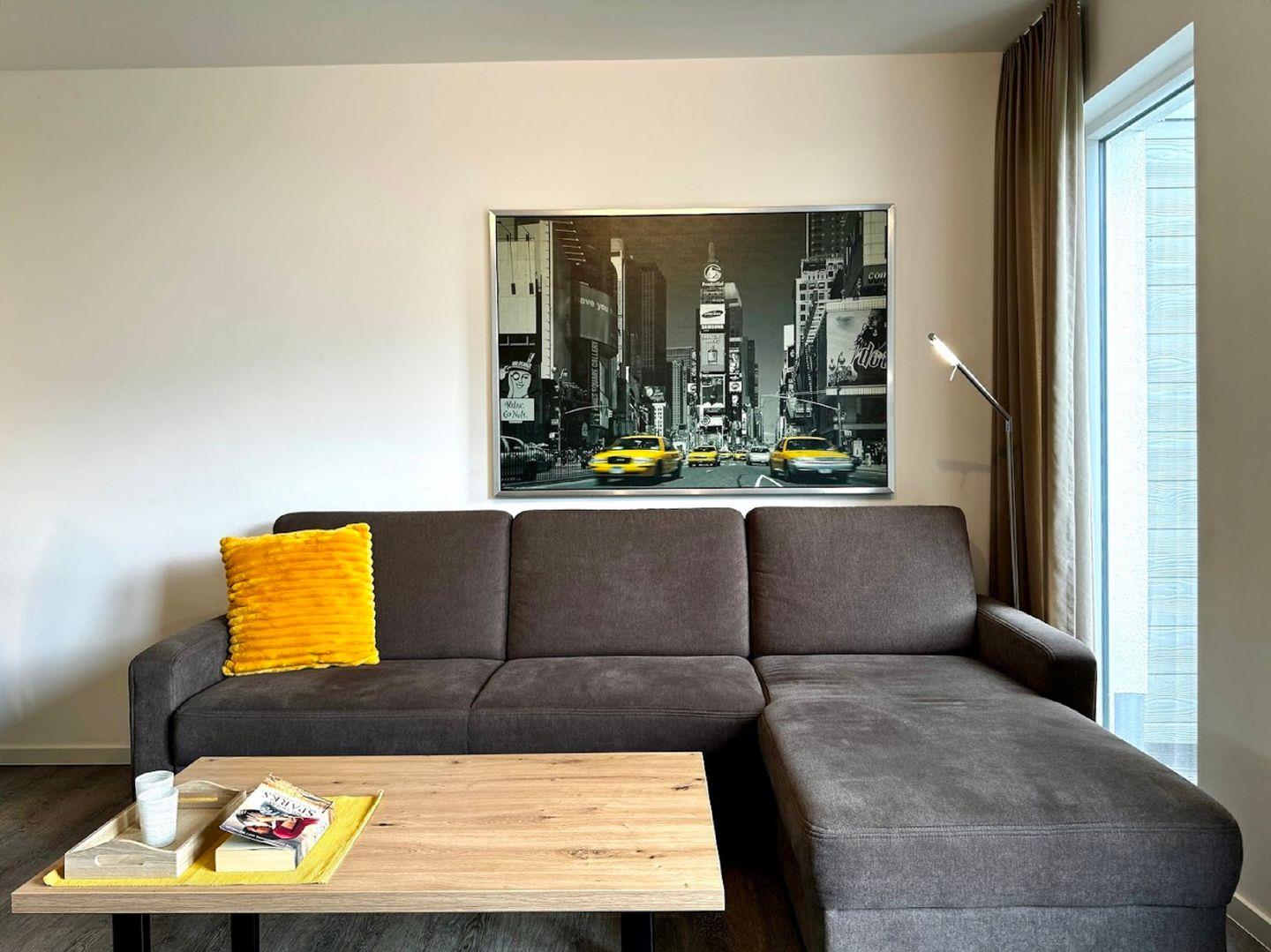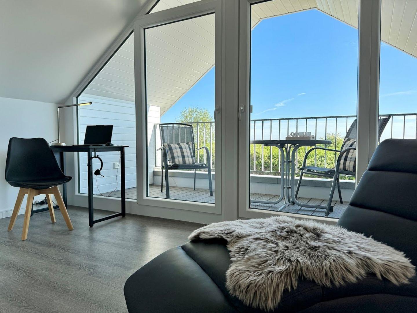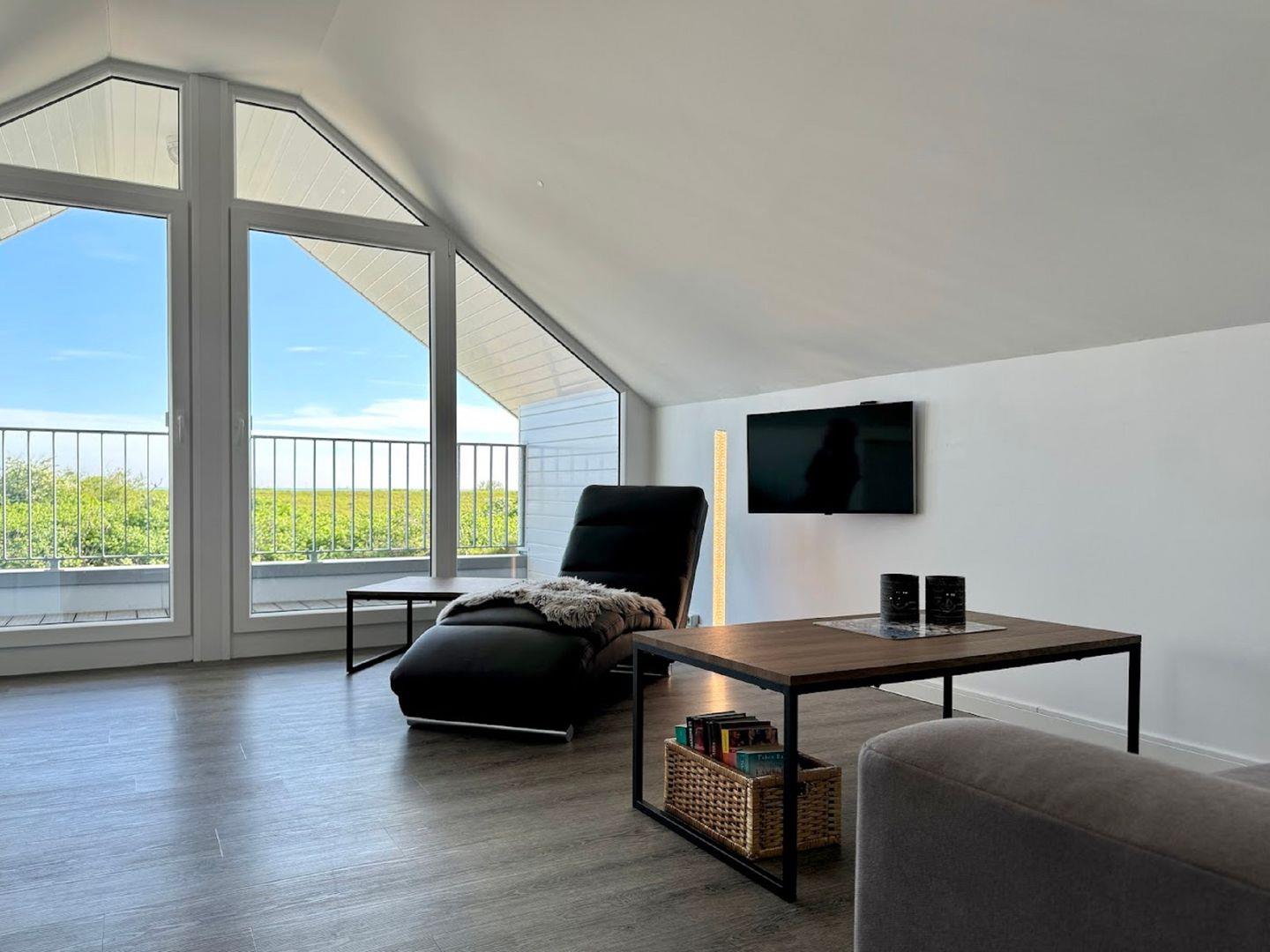 Auch hier bietet eine gemütliche Sofaecke mit Fernseher und eine Relax Liege die Möglichkeit zum Entspannen. Ein Home-Office Arbeitsplatz ergänzt die Möglichkeiten.