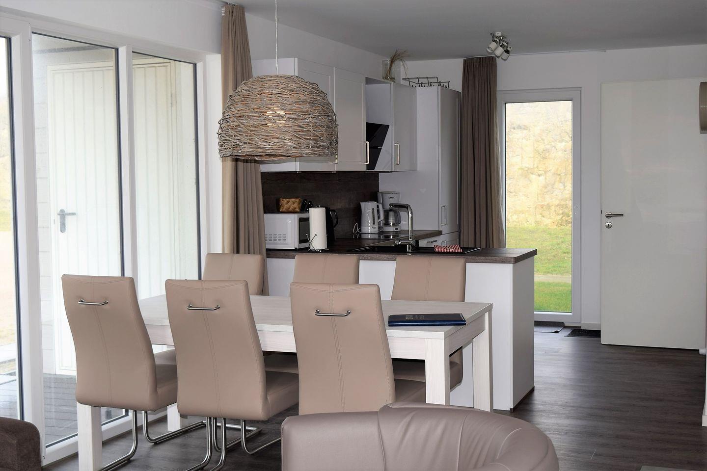 Die Küche ist offengehalten und mit einer hochwertigen Einbauküche inklusive Mikrowelle ausgestattet.