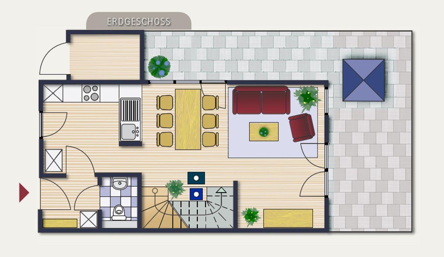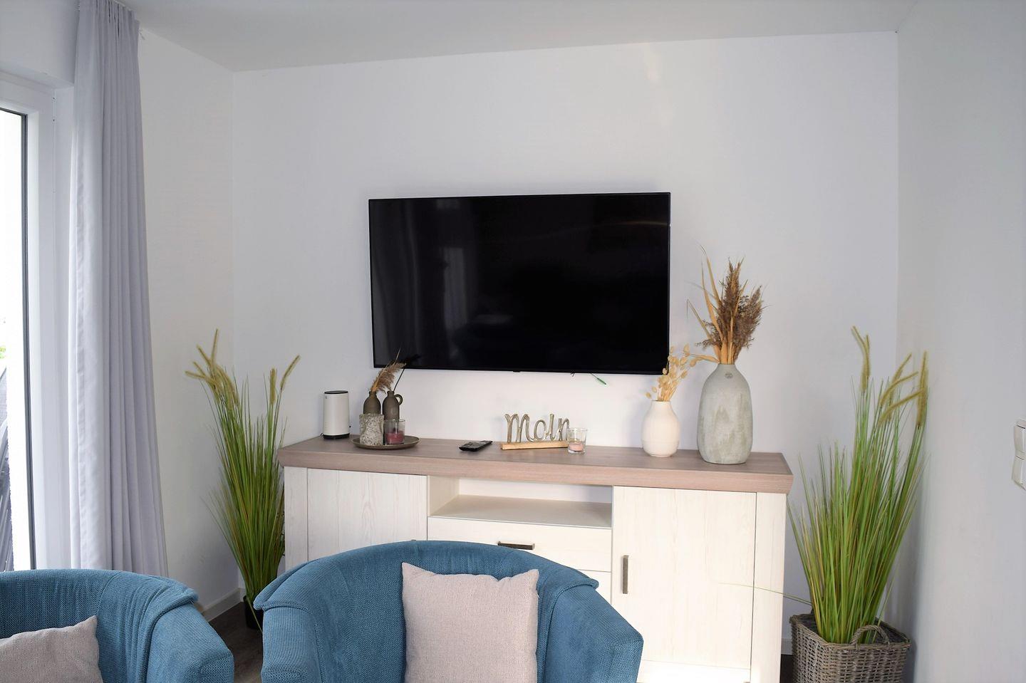 Im hinteren Bereich, zur Terrasse gelegen, steht eine gemütliche Sofaecke mit Fernseher zur Verfügung. Ein Gäste-WC ist ebenfalls im Erdgeschoss vorhanden.