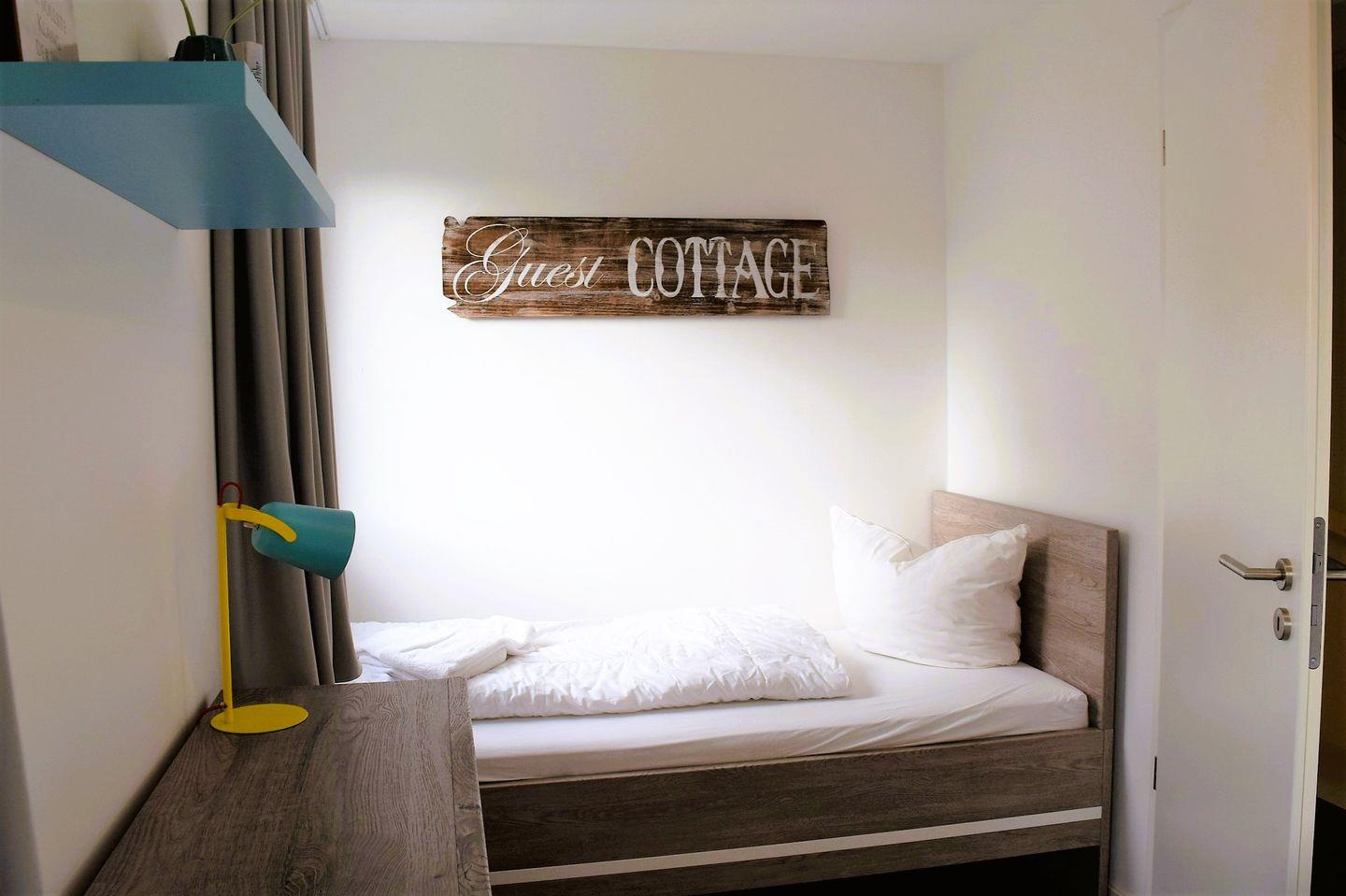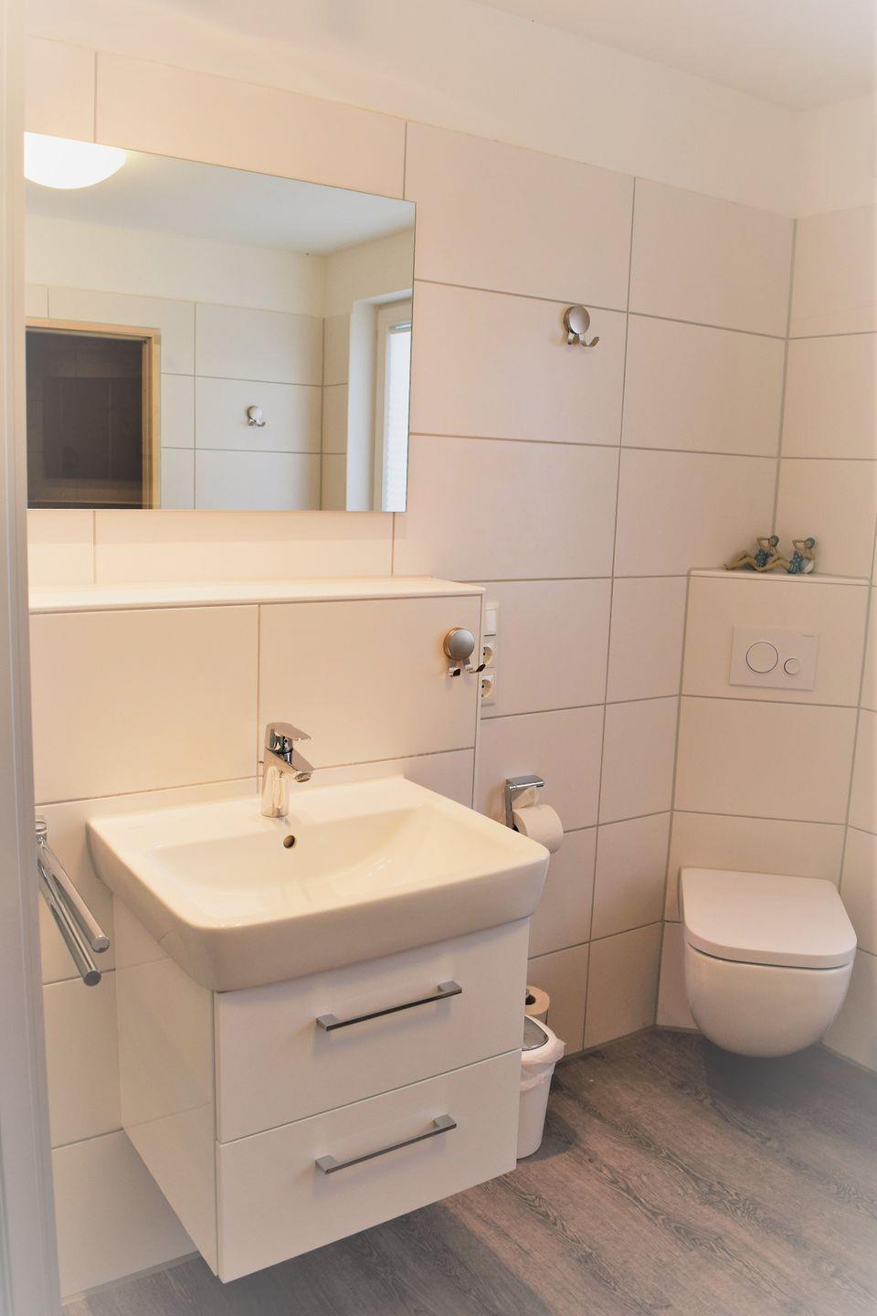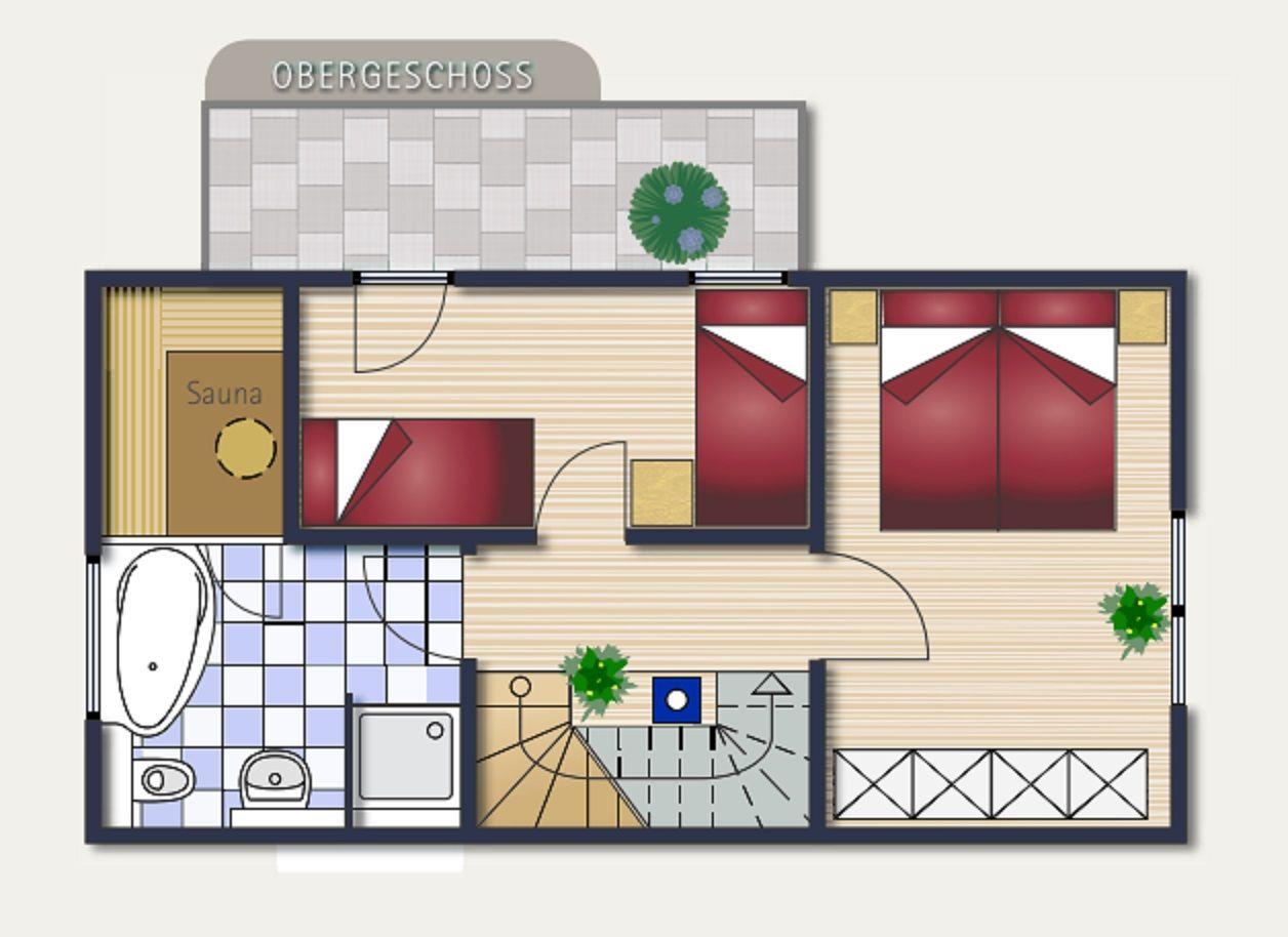 Die erste Etage bietet Ihnen neben zwei Schlafräumen das große Bad mit Regendusche, Badewanne und hauseigener Sauna. An stürmischen und/oder regnerischen Tagen kann das Badezimmer mit seiner Vollausstattung zum Wellnesstempel werden. Die Schlafzimmer sind mit einem Doppelbett bzw. 2 Einzelbetten sowie je einem Kleiderschrank ausgestattet.
