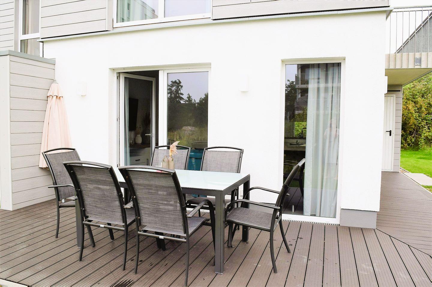 Die große und über Eck laufende Süd-Terrasse ist mit einem Tisch und sechs Stühlen und einem Sonnenschirm möbliert.