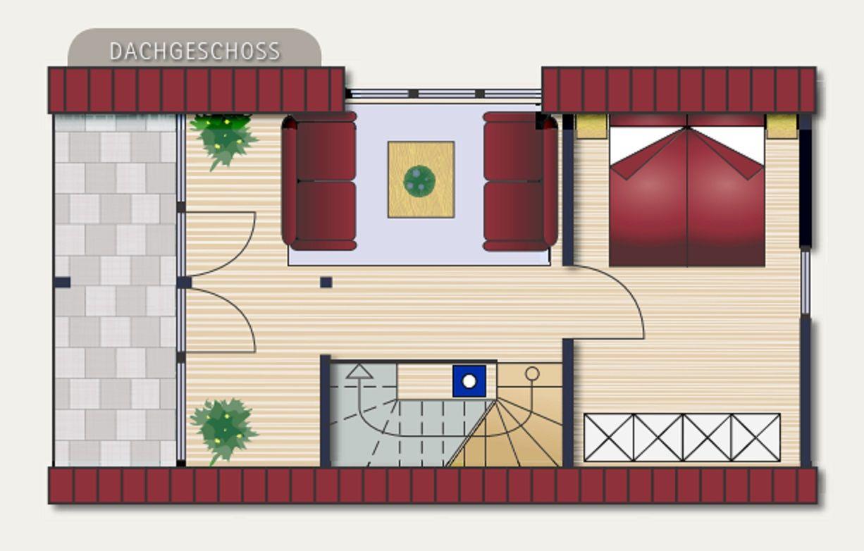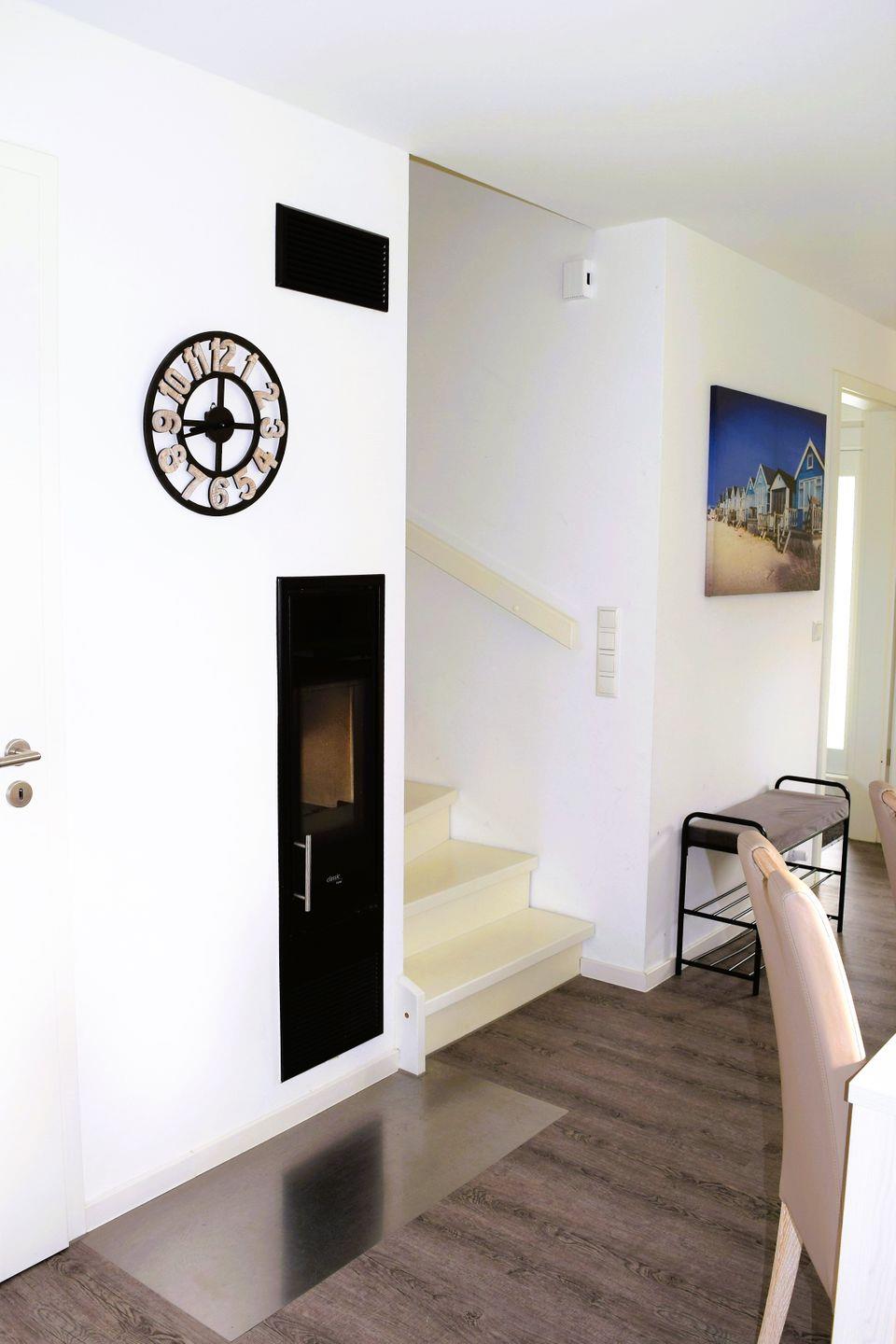 Der zentrale Punkt auf dieser Ebene ist der große Esstisch mit sechs Stühlen. Hier kann neben den Mahlzeiten die Geselligkeit gelebt werden. Der Kaminofen wird mit seinem Wohlfühlcharakter dazu beitragen. Die Befeuerung darf ausschließlich mit Holzbriketts erfolgen!