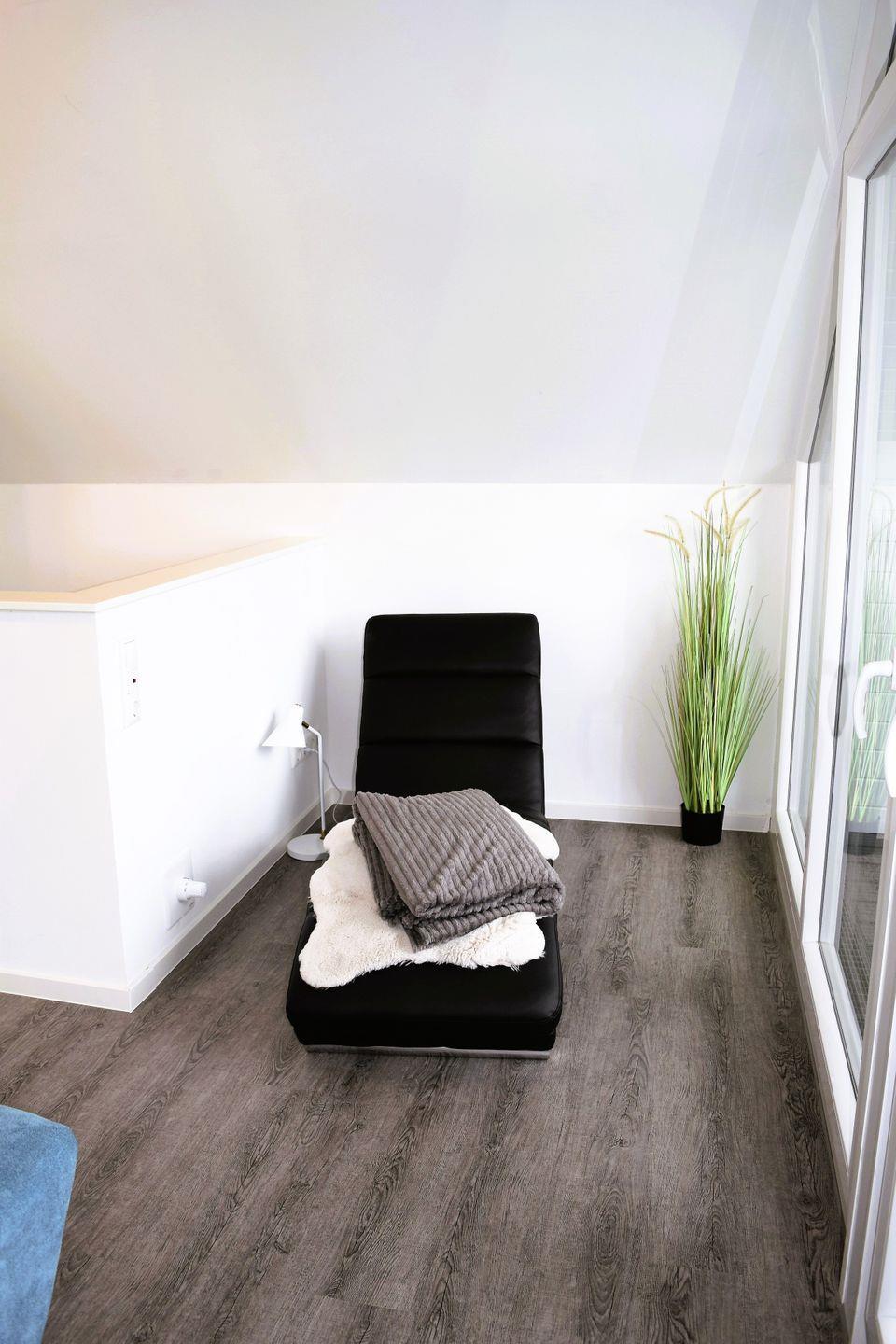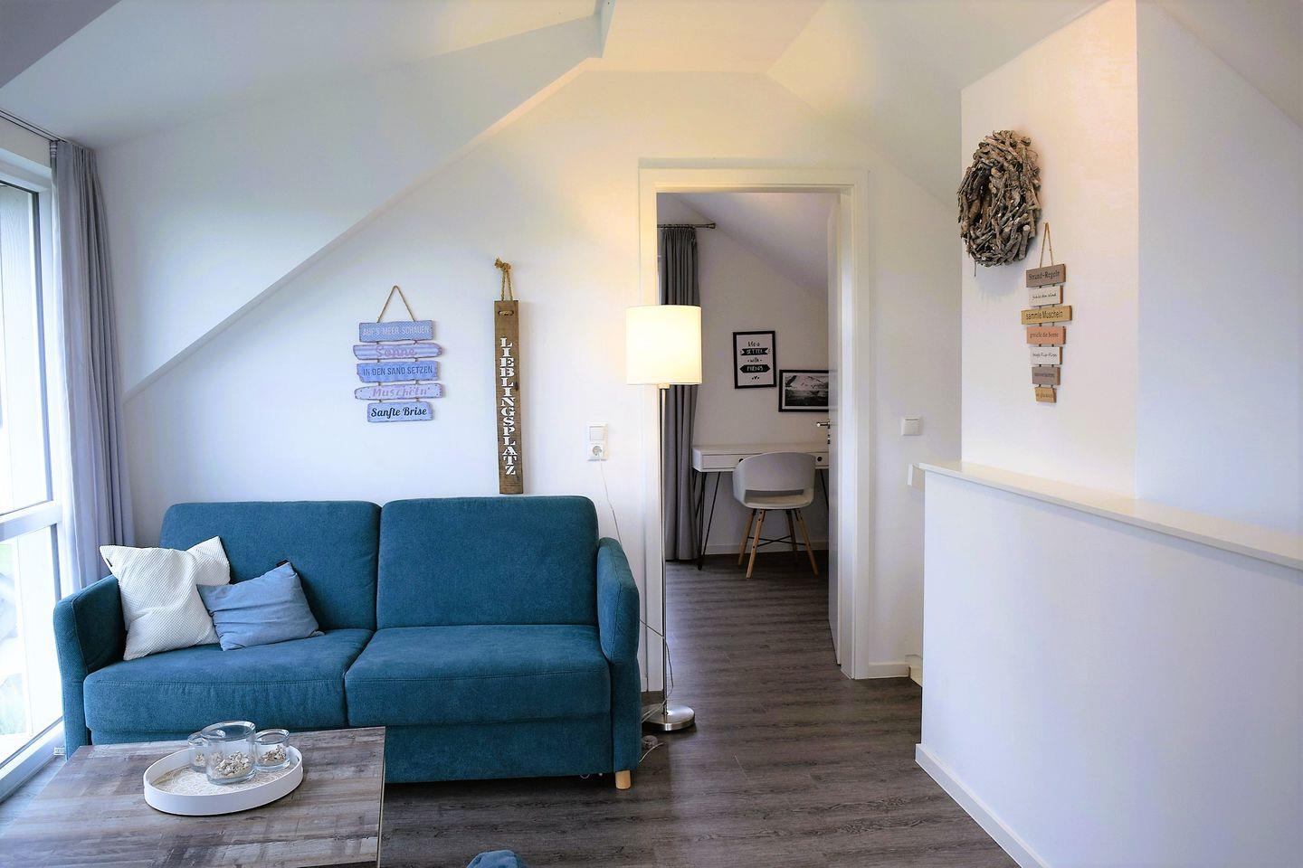 Die Galerie im 2. OG mit Zugang zur Loggia ist ein großartiger Rückzugsort. Von hier oben genießt man einen herrlichen Blick auf das Wattenmeer. Auch hier bietet ein gemütliches Sofa die Möglichkeit zum Entspannen. Das dritte Schlafzimmer mit Doppelbett, Kleiderschrank und Schreibtisch schließt sich an.