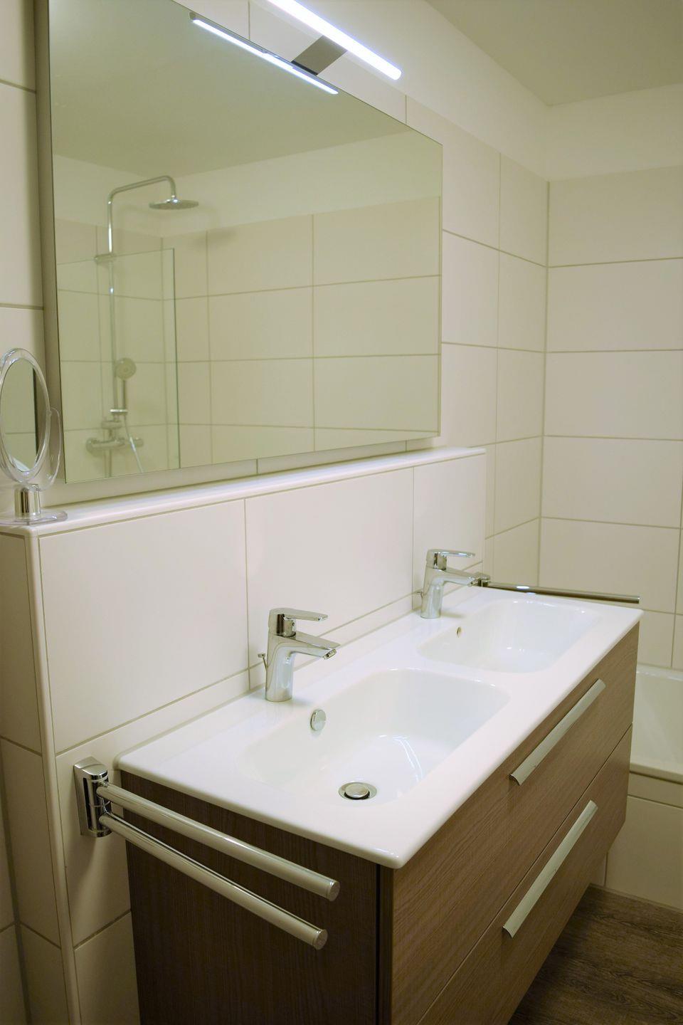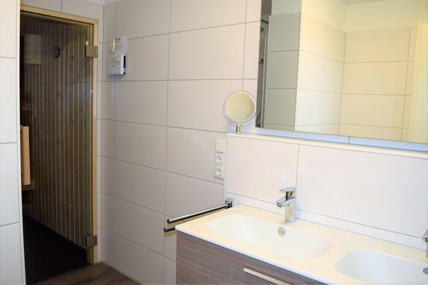 Die erste Etage bietet Ihnen neben zwei Schlafräumen, das große Bad, mit Doppelwaschbecken, zwei Duschen, einer Badewanne sowie einer hauseigenen Sauna.