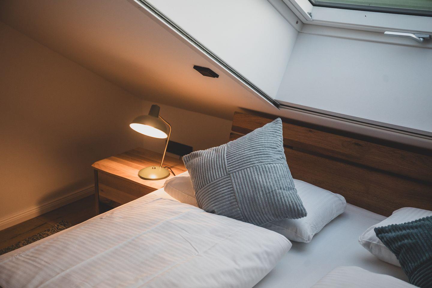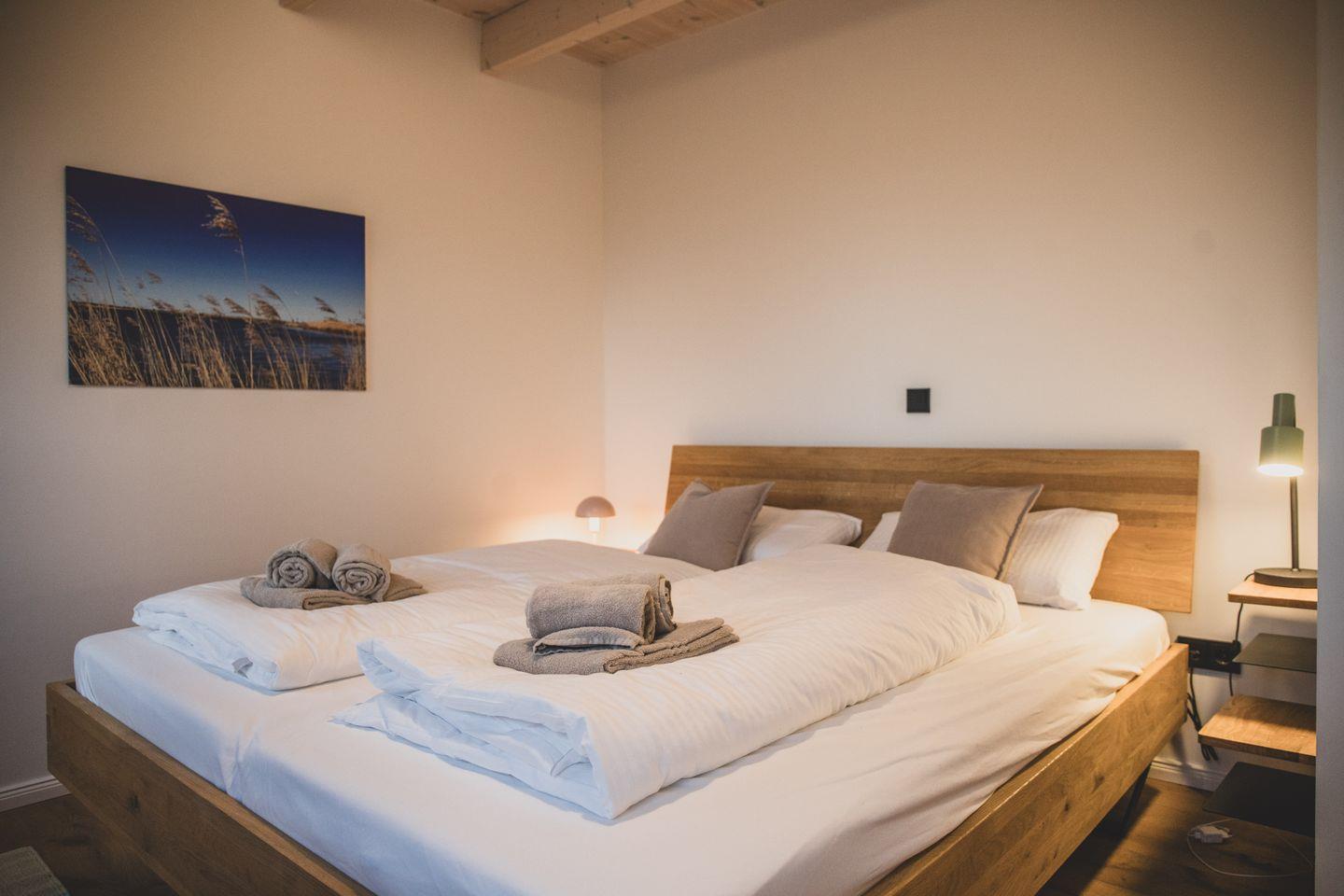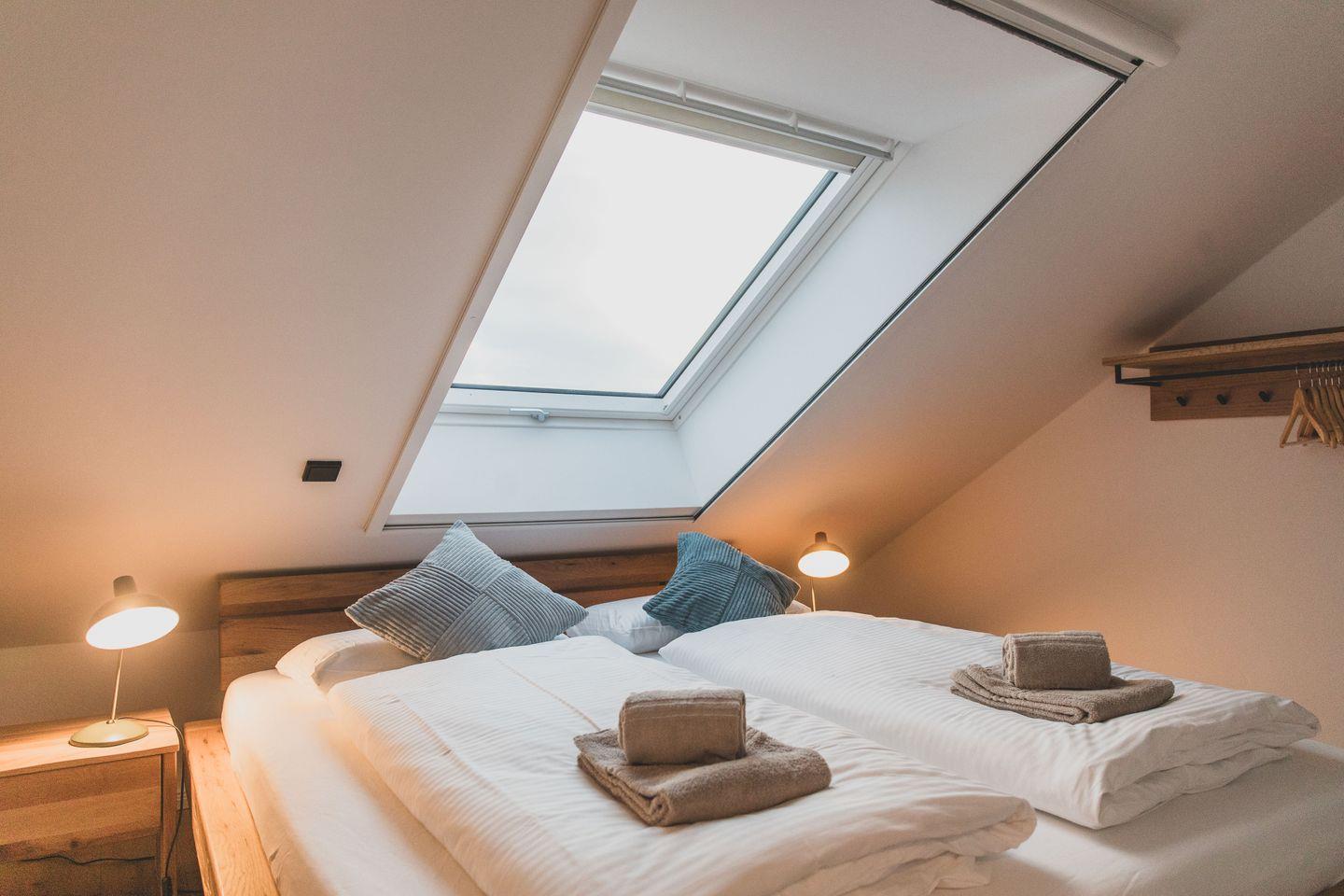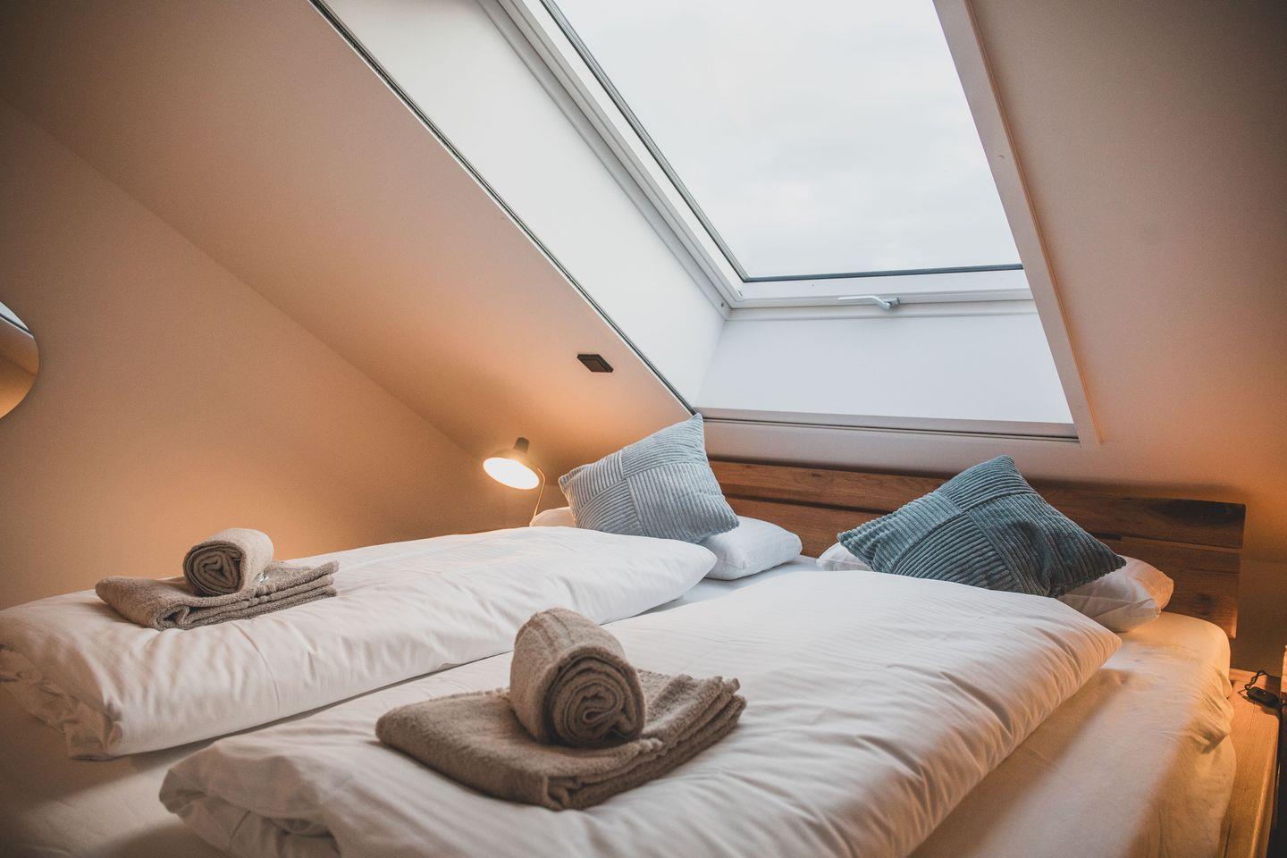 Das Obergeschoss verfügt neben Bad und Sauna über 2 geschmackvoll eingerichtete Schlafzimmer. Eines mit Doppelbett 200 × 180 cm und nach Westen ausgerichteten großen Fenstern und eines ebenfalls mit Doppelbett 200 × 180 cm, mit einem direkt über dem Bett positionierten Dachfenster welches traumhafte Blicke in den Sternenhimmel ermöglicht.