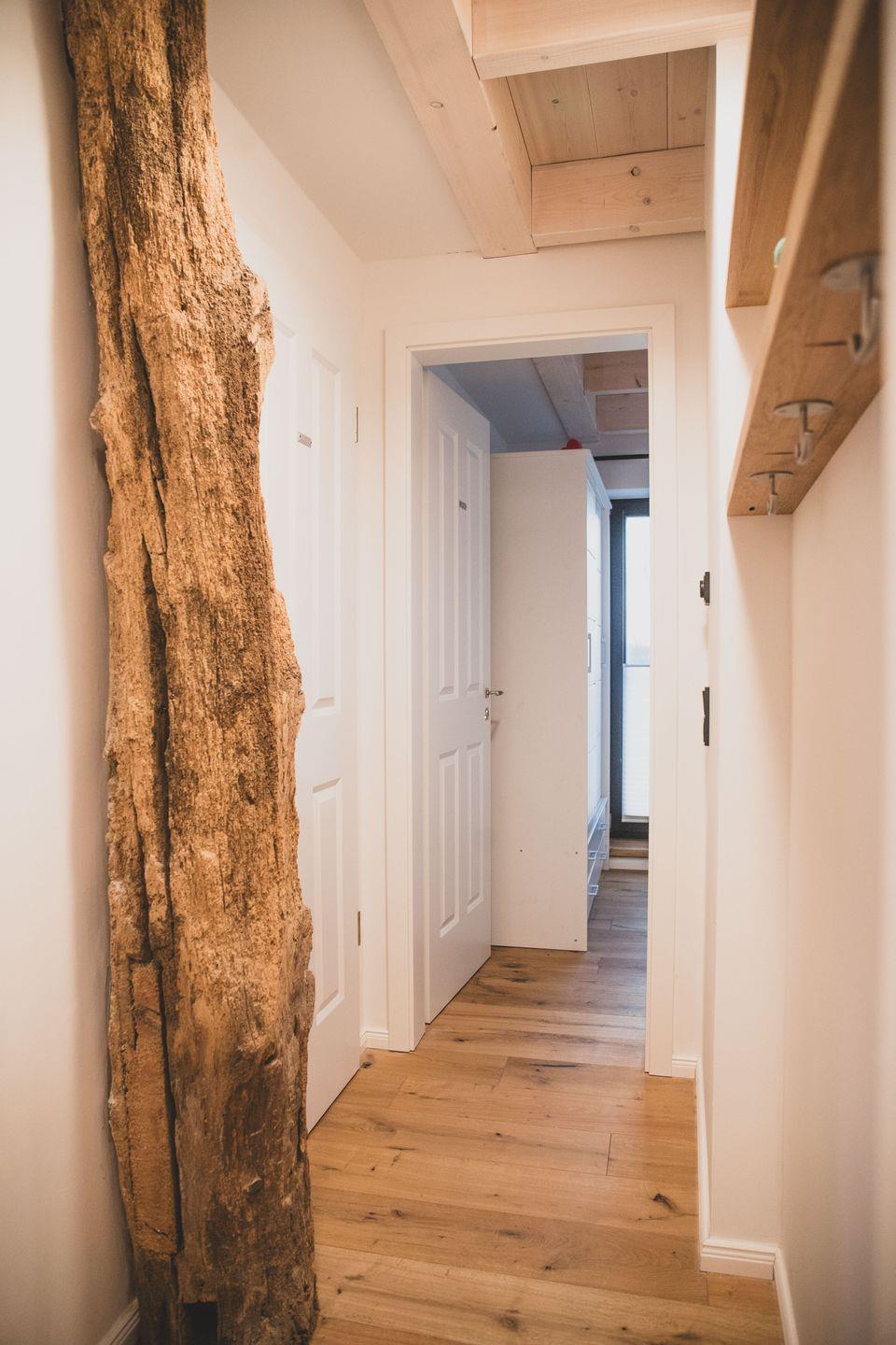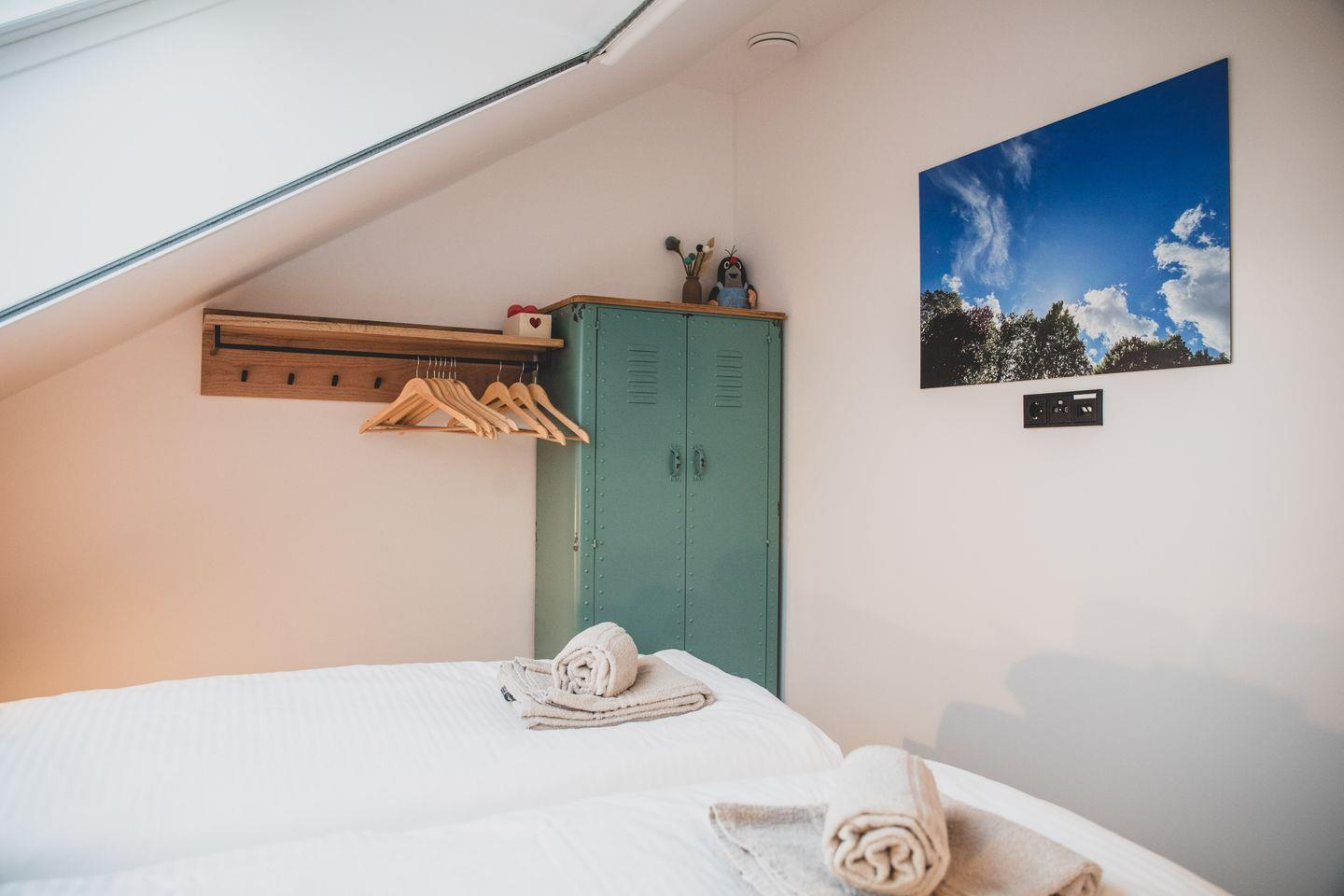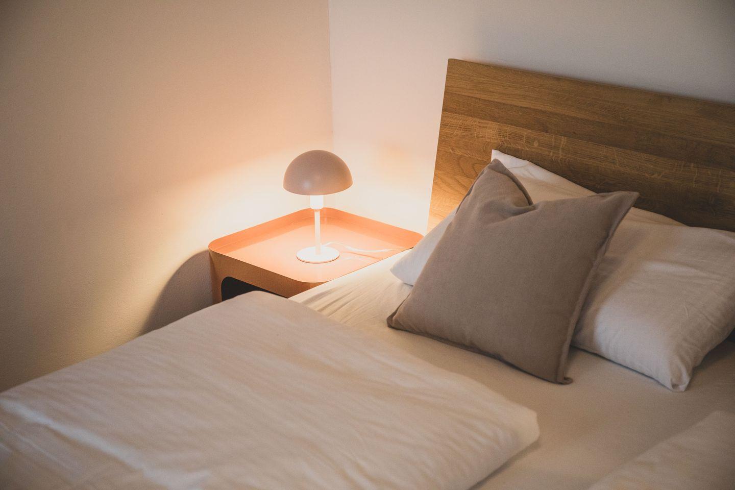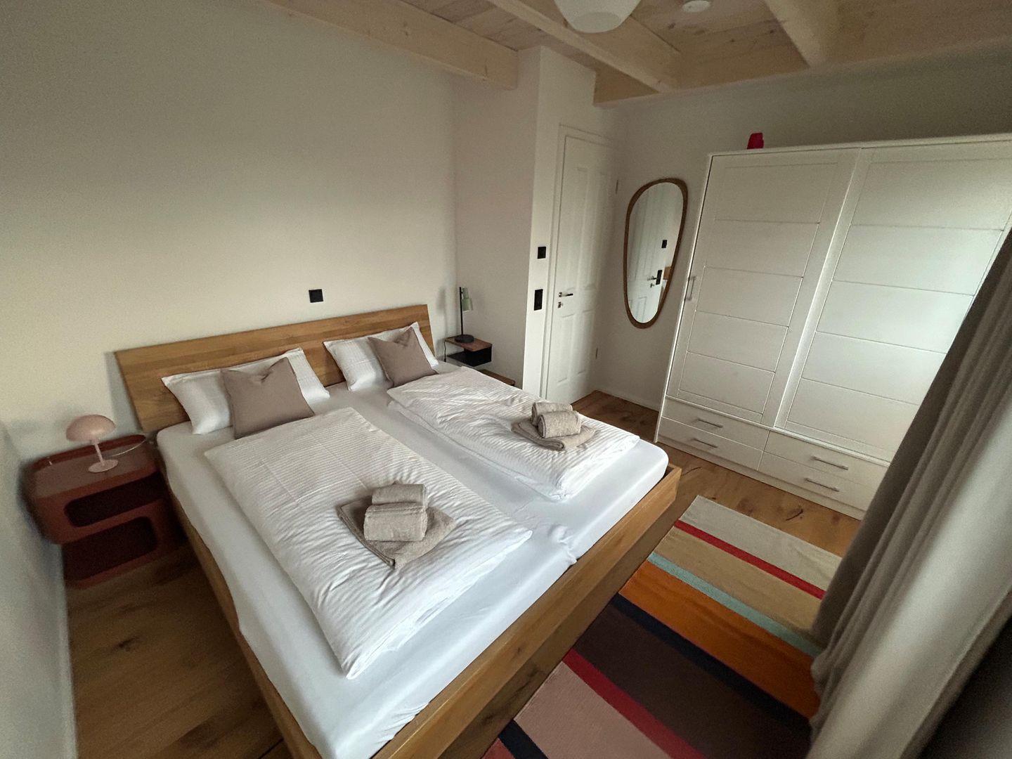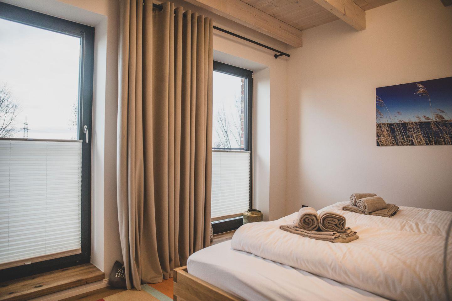 Das Obergeschoss verfügt neben Bad und Sauna über 2 geschmackvoll eingerichtete Schlafzimmer. Eines mit Doppelbett 200 × 180 cm und nach Westen ausgerichteten großen Fenstern und eines ebenfalls mit Doppelbett 200 × 180 cm, mit einem direkt über dem Bett positionierten Dachfenster welches traumhafte Blicke in den Sternenhimmel ermöglicht.
