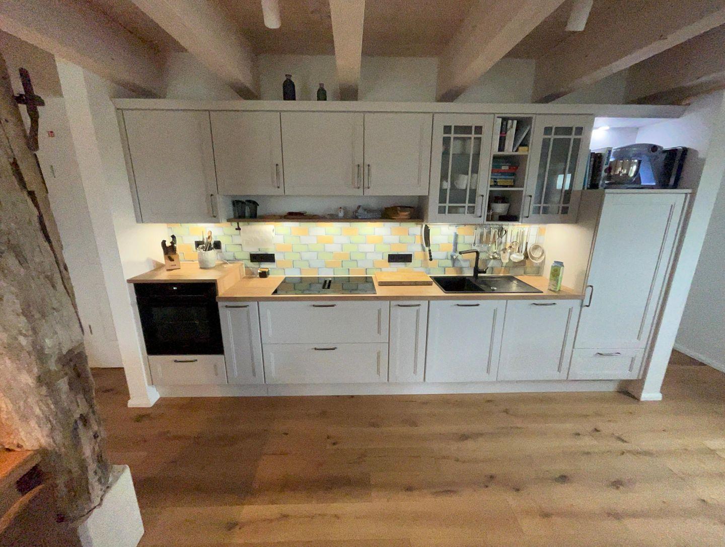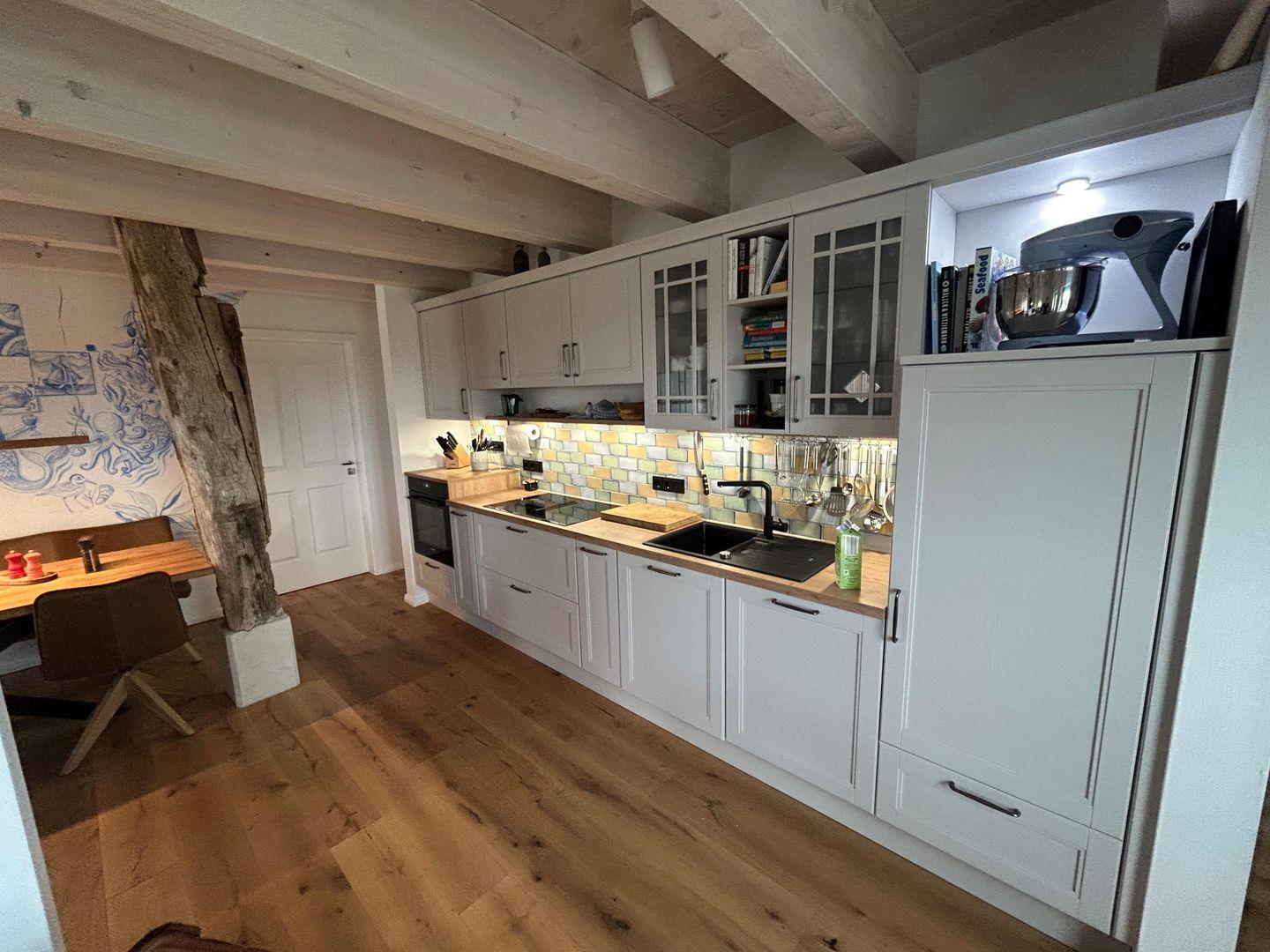 Der Küchenbereich ist komplett ausgestattet, sowie mit hochwertigen Elektrogeräten, einem Geschirrspüler und einem Kühlschrank mit Eisfach versehen.
