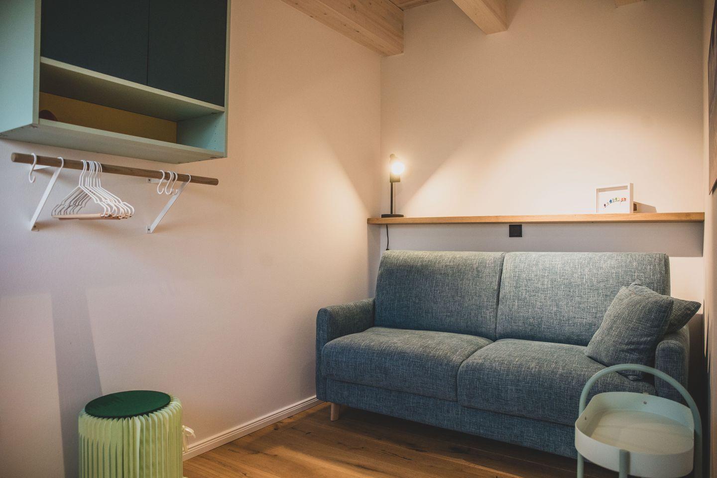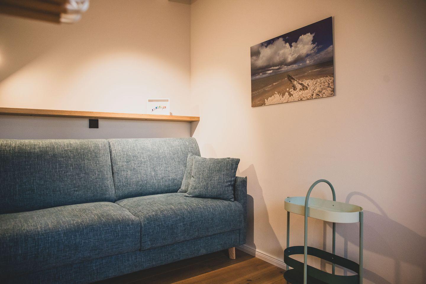 Außerdem befindet sich im Erdgeschoss noch ein kleines Zimmer welches sowohl als Arbeitsbereich aber auch als zusätzliches Schlafzimmer (Schlafsofa mit vollwertiger Matratze 200 x 140 cm) genutzt werden kann. Der Erdgeschossbereich sowie dieses Schlafzimmer und das Bad im Erdgeschoss sind barrierefrei gestaltet. Zum Eingang der Wohnung führt nur eine Stufe. Eine mobile, klappbare Rollstuhlrampe gehört zur Ausstattung der Ferienwohnung.