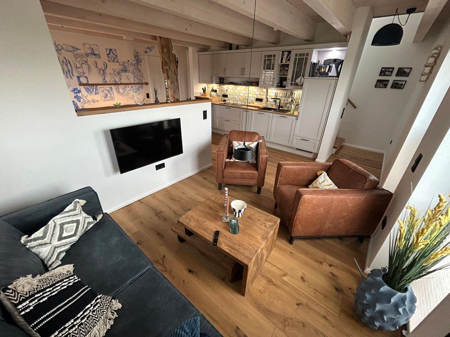 Diese reicht über echt Holzparkett, Fußbodenheizung, Smart TV, Bluetooth Lautsprecher (Teufel-Station), eine vollständig ausgestattete Küche, Ledersessel und -Stühle und Massivholzmöbel, einen Geschirrspüler, Espressomaschine, Toaster, WLAN, und vieles, vieles mehr.