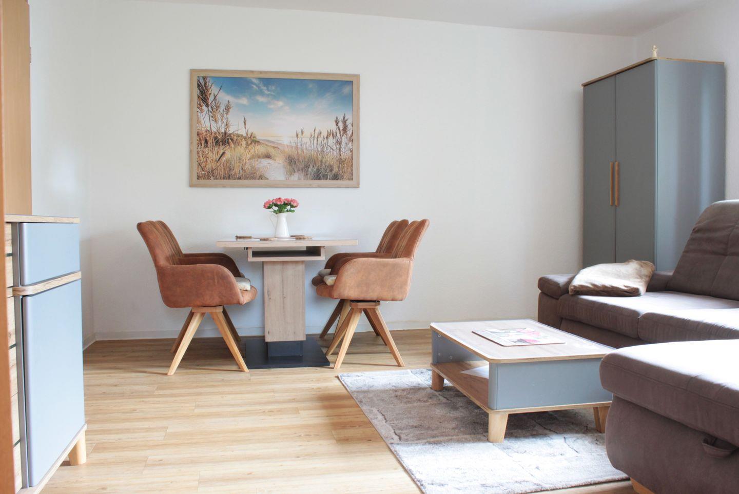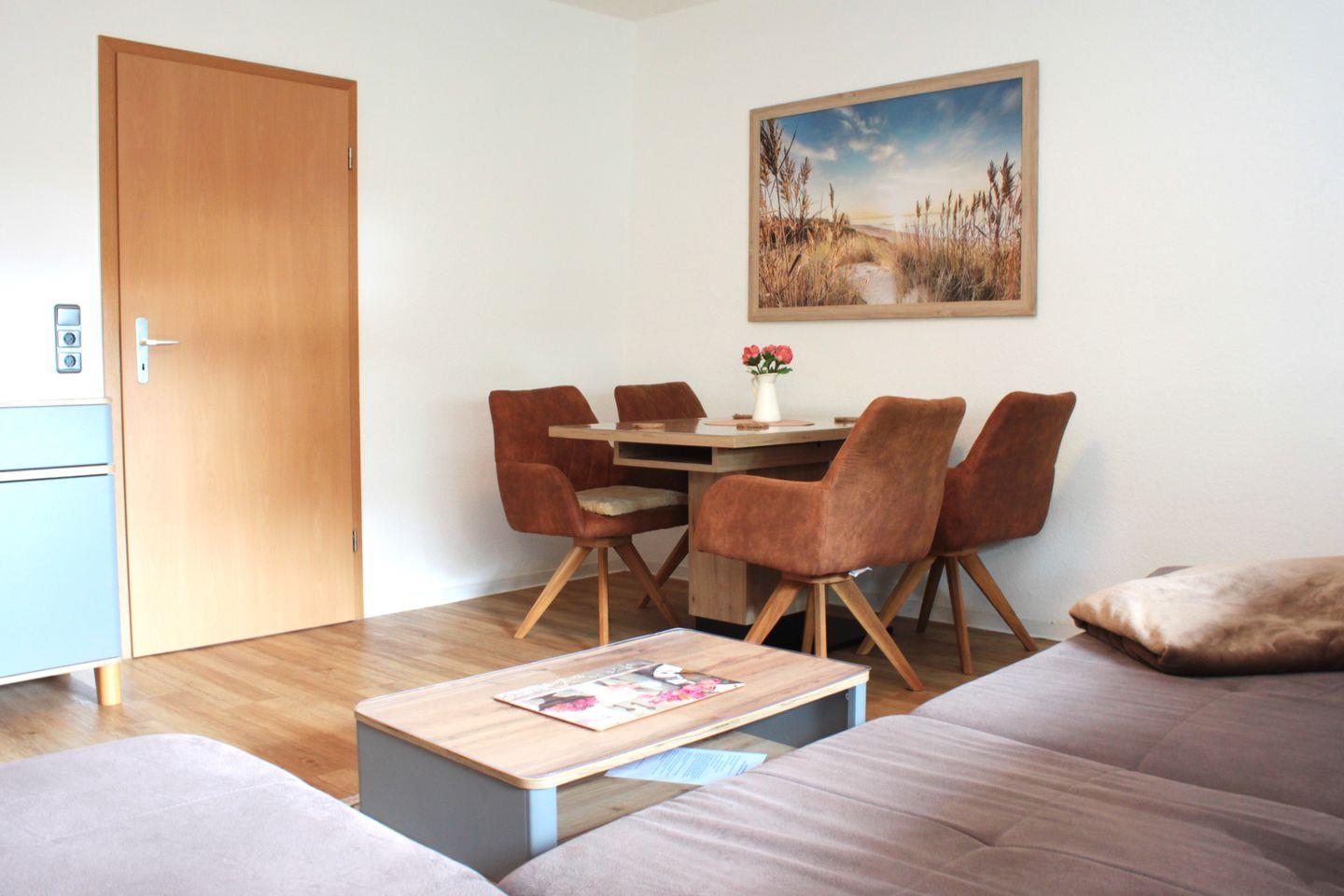 Der kombinierte Wohn- und Essbereich ist ausgestattet mit einer gemütlichen Sofaecke mit TV-Gerät und einem Esstisch.