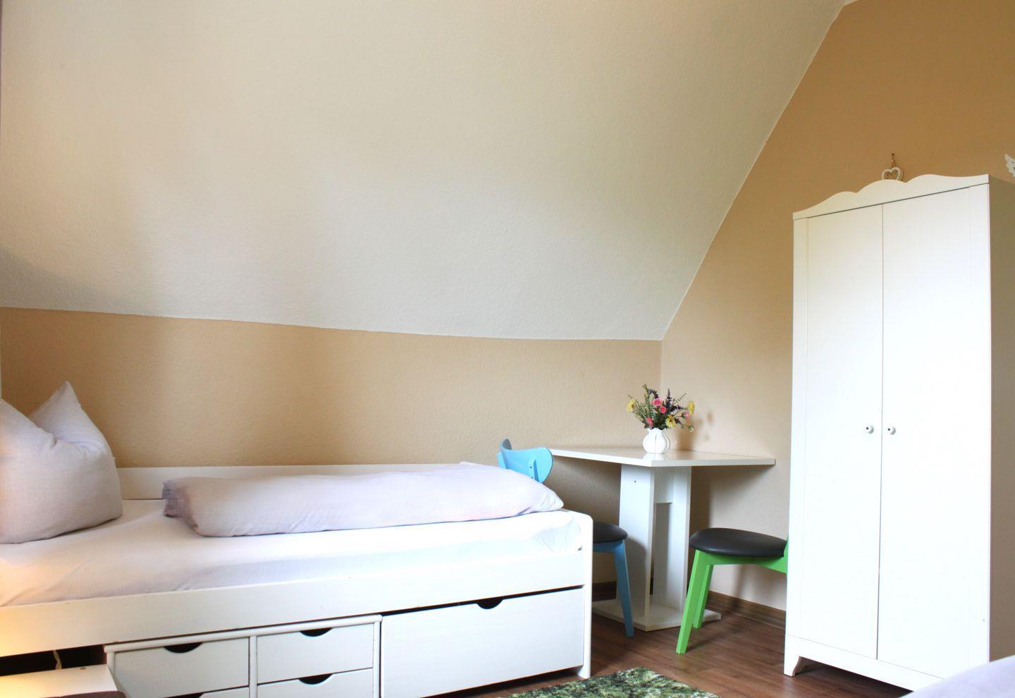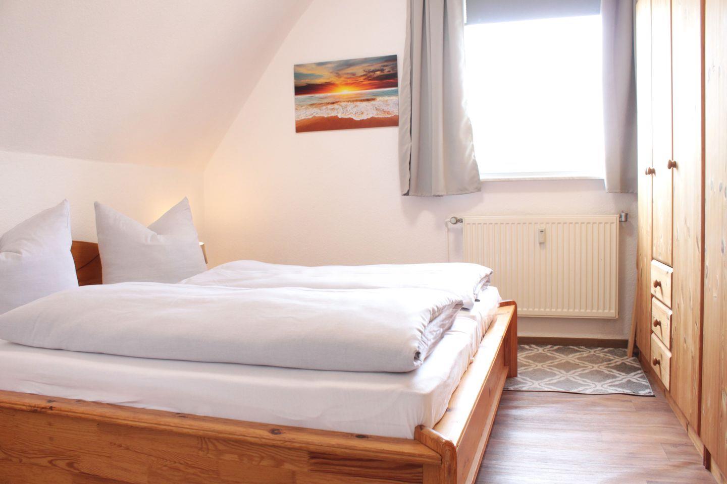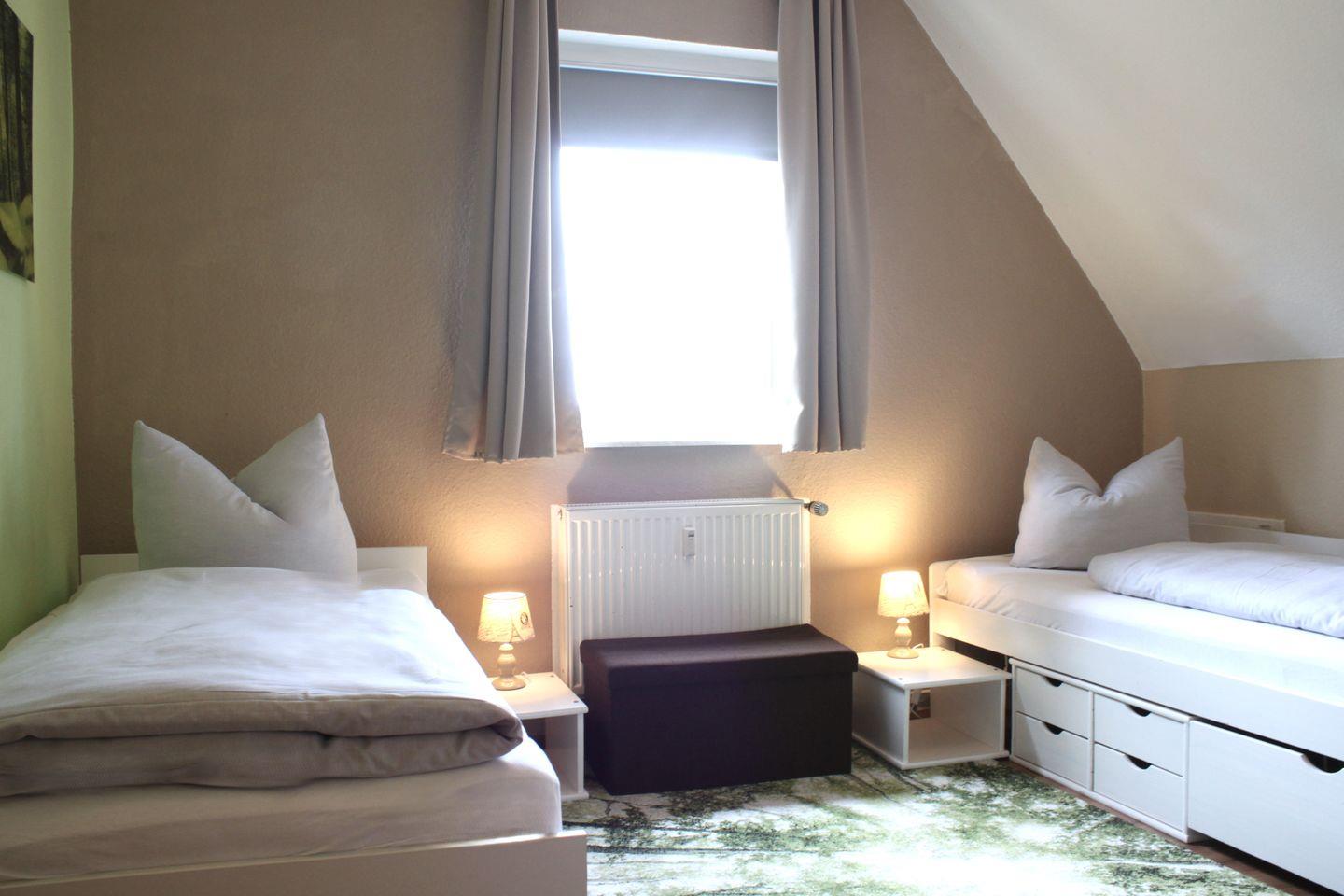 Das zweite Schlafzimmer verfügt über zwei Einzelbetten, mit Nachttischen. In dem Zimmer befindet sich zusätzlich noch ein Kleiderschrank und ein Tisch mit zwei Stühlen.