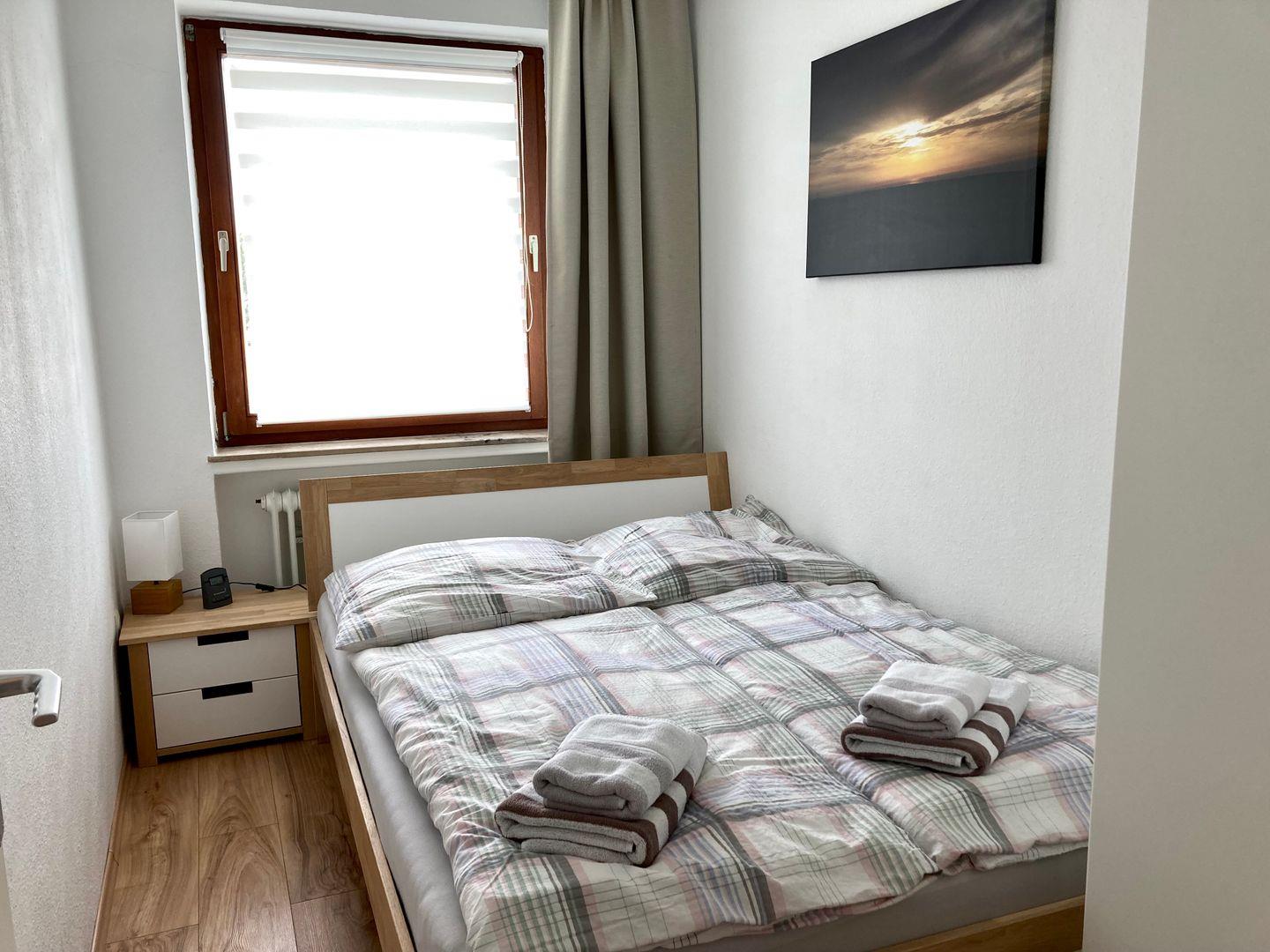 Das separate Schlafzimmer dieser Wohnung wurde charmant im skandinavischen Stil eingerichtet und mit einem gemütlichen Doppelbett, sowie Kleiderschrank ausgestattet.