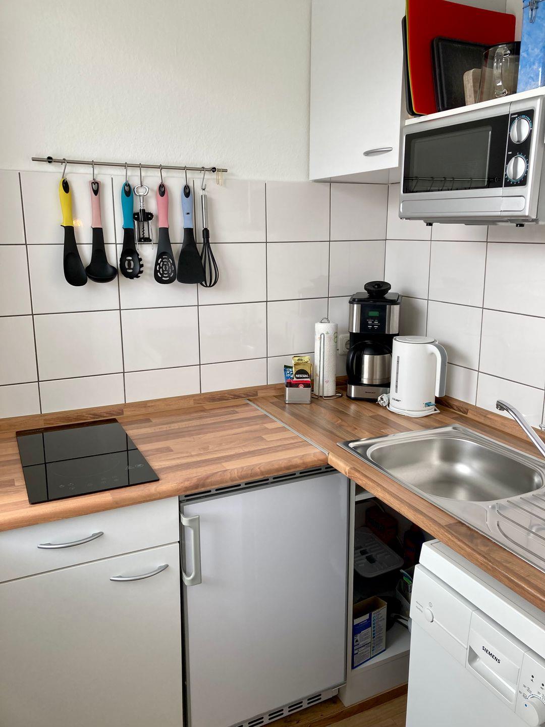 Die Küchenzeile ist funktionell und modern eingerichtet. Neben Herd, Spüle und Kühlschrank stehen Ihnen auch Mikrowelle und Geschirrspüler zur Verfügung. So können Sie sich ganz bequem selbst verpflegen.